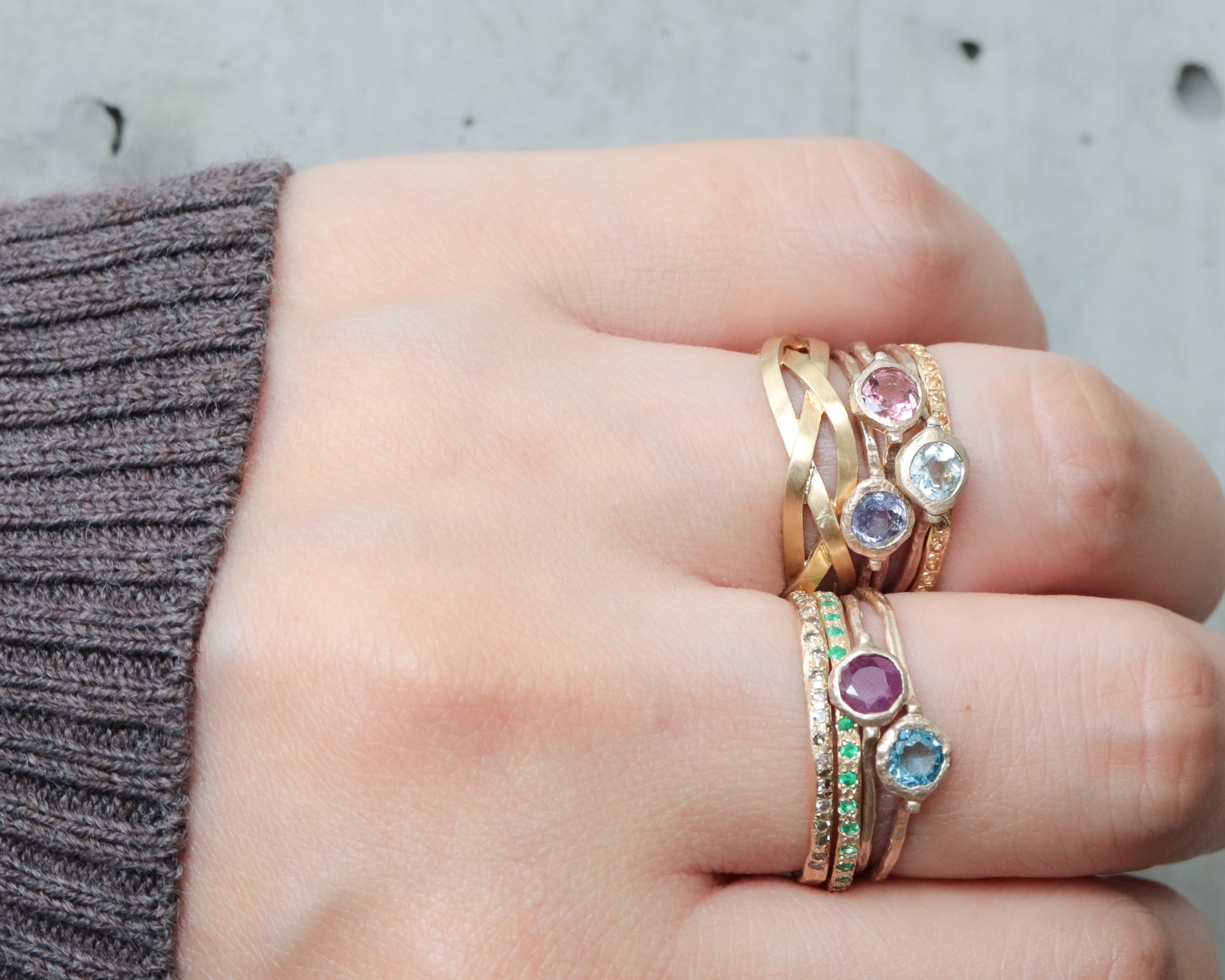 めぐり合わせや切れ目のない関係を、ラウンドのシンプルなリングで表現したen。ダイアモンド、ブルーダイアモンド、エメラルドはファッションとしても。四光留めと技法でダイアモンド1点1点を丁寧に彫留めし、どこまでも輝く星空をイメージして、どの角度から見てもドット状に見えるようにダイアモンドをセッティングしました。