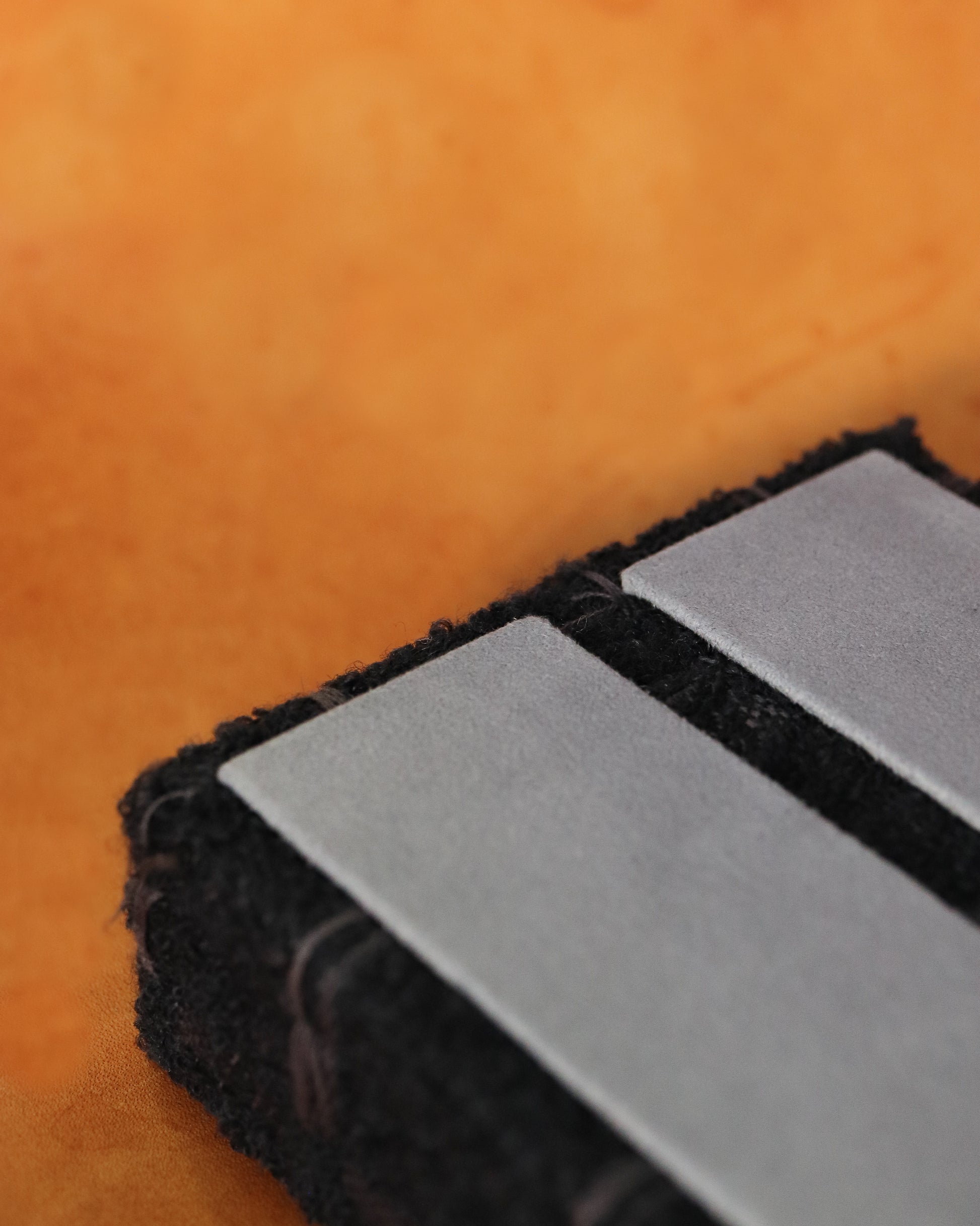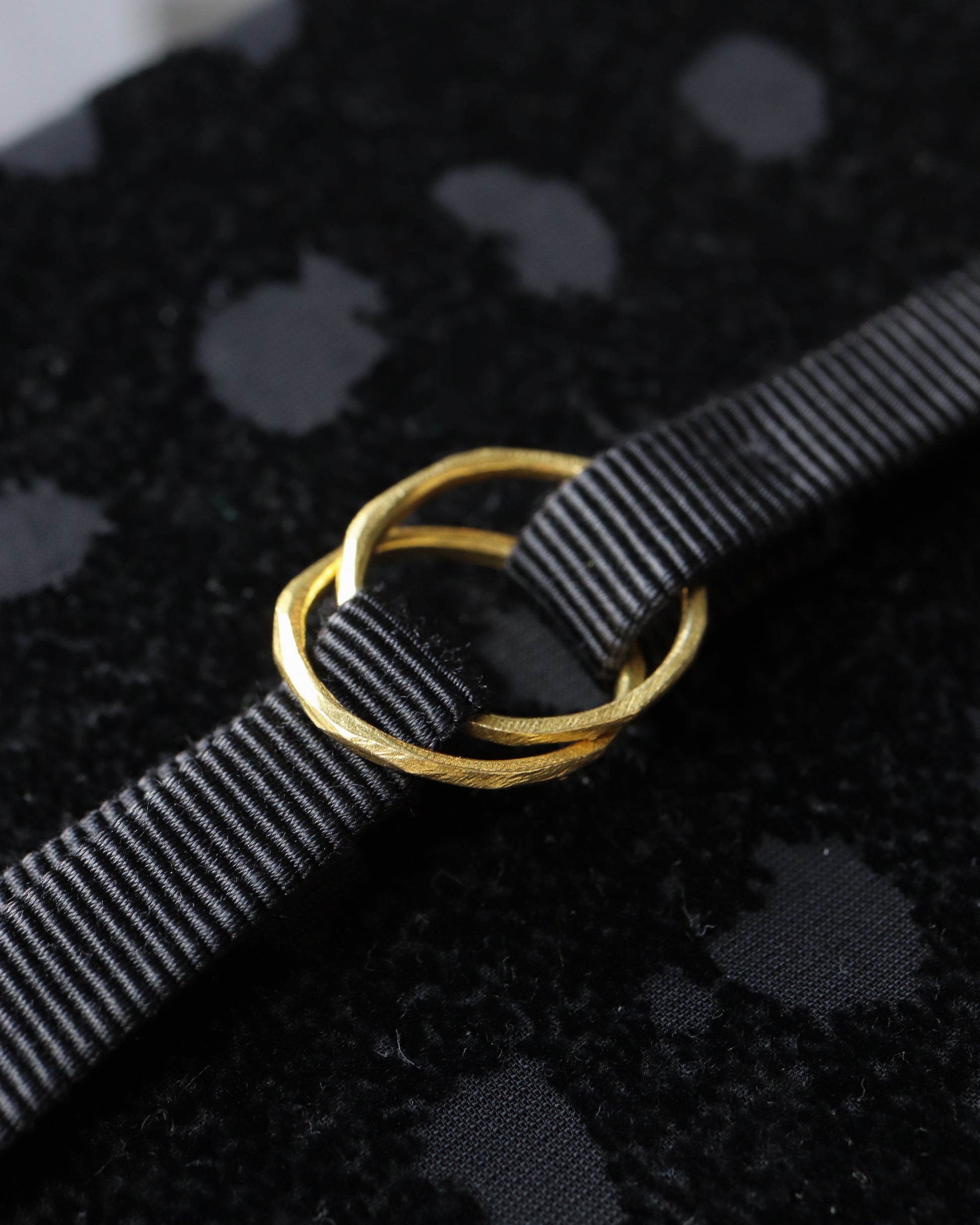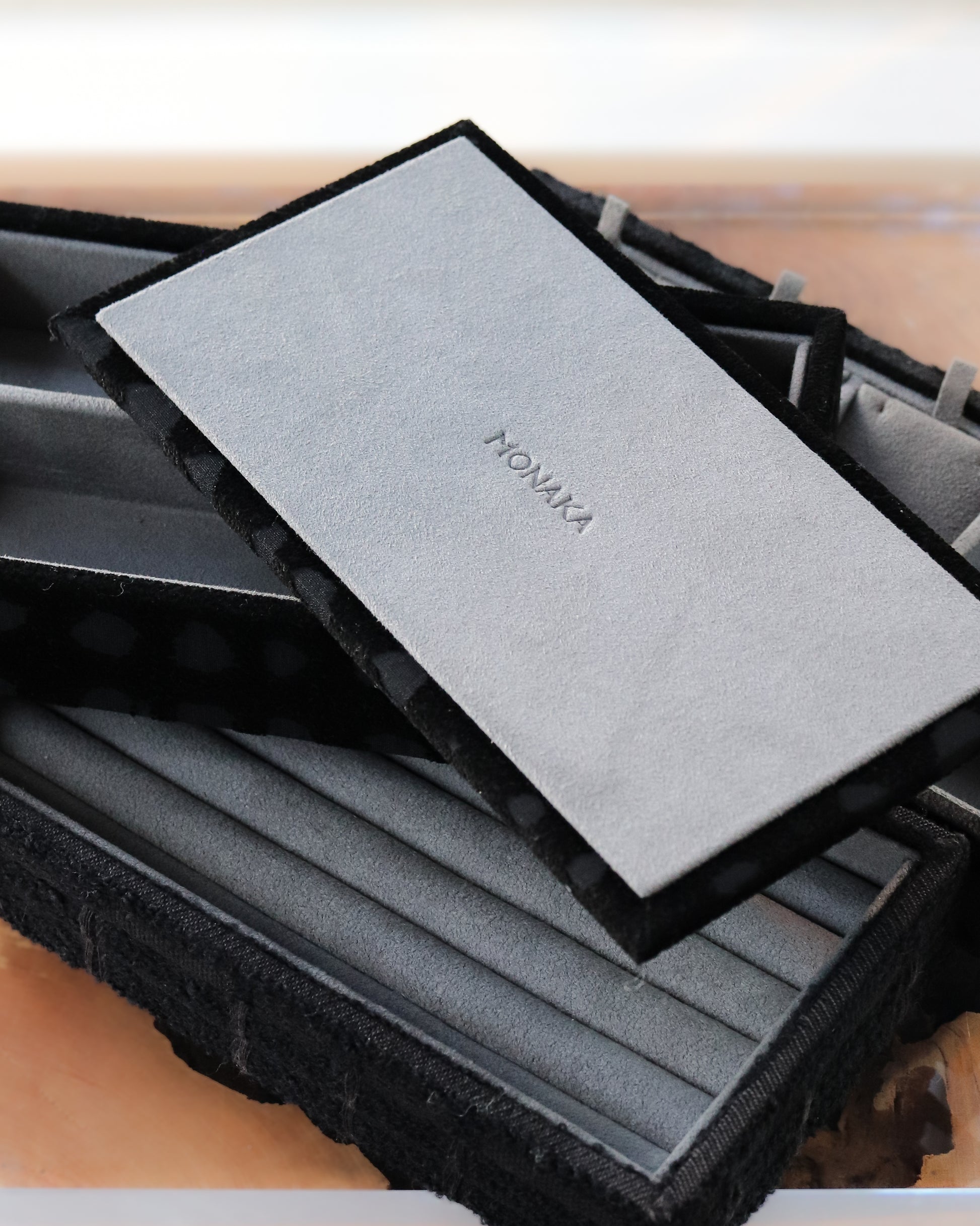 Washi paper, ink, and thread. We have selected three unique textiles that offer a modern interpretation of traditional Japanese beauty. The inside is made of gray fabric, a color that has long been used in MONAKA displays. This color is embodied in the brand's identity, and it brings out the vividness of the colored stones and the brilliance of the metal in the most beautiful way.