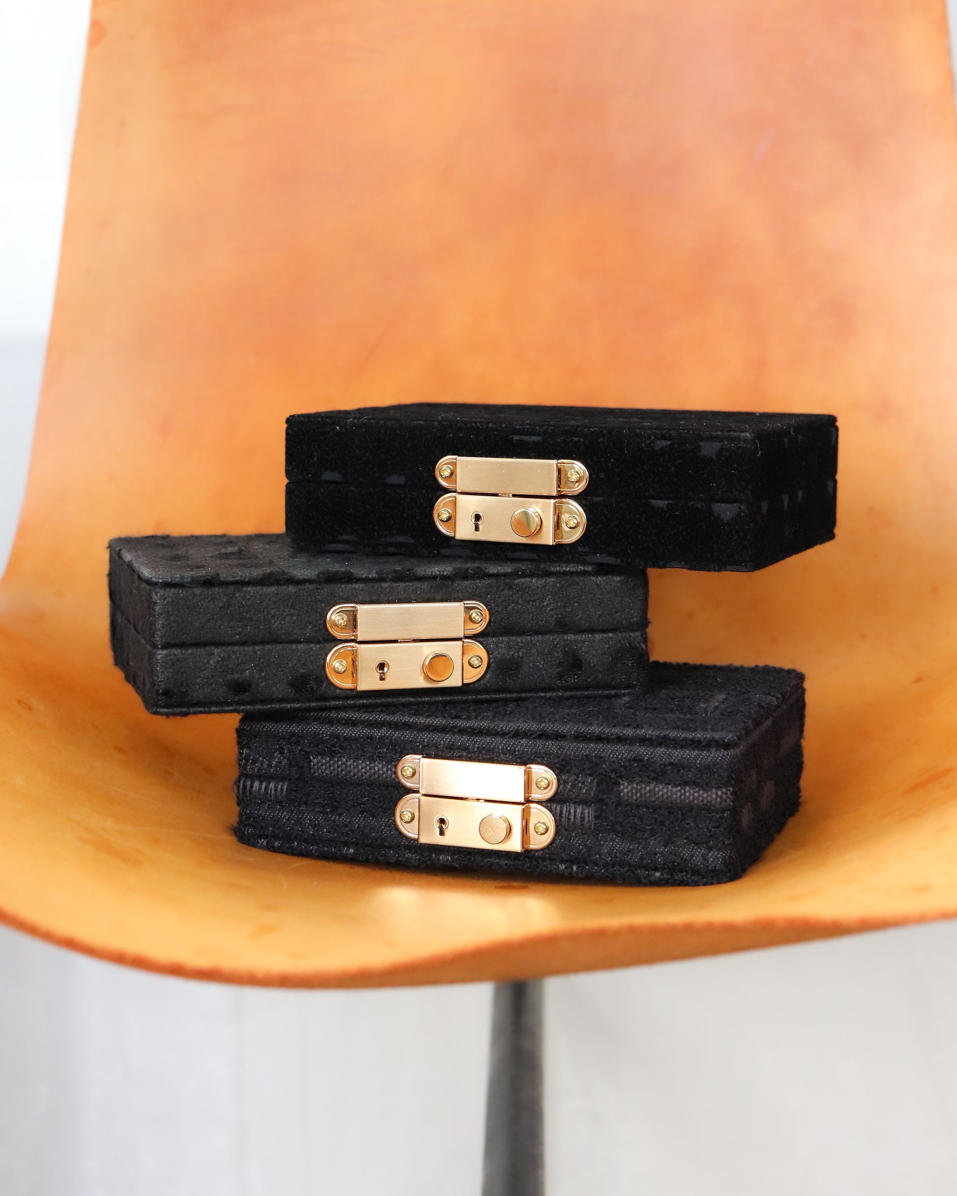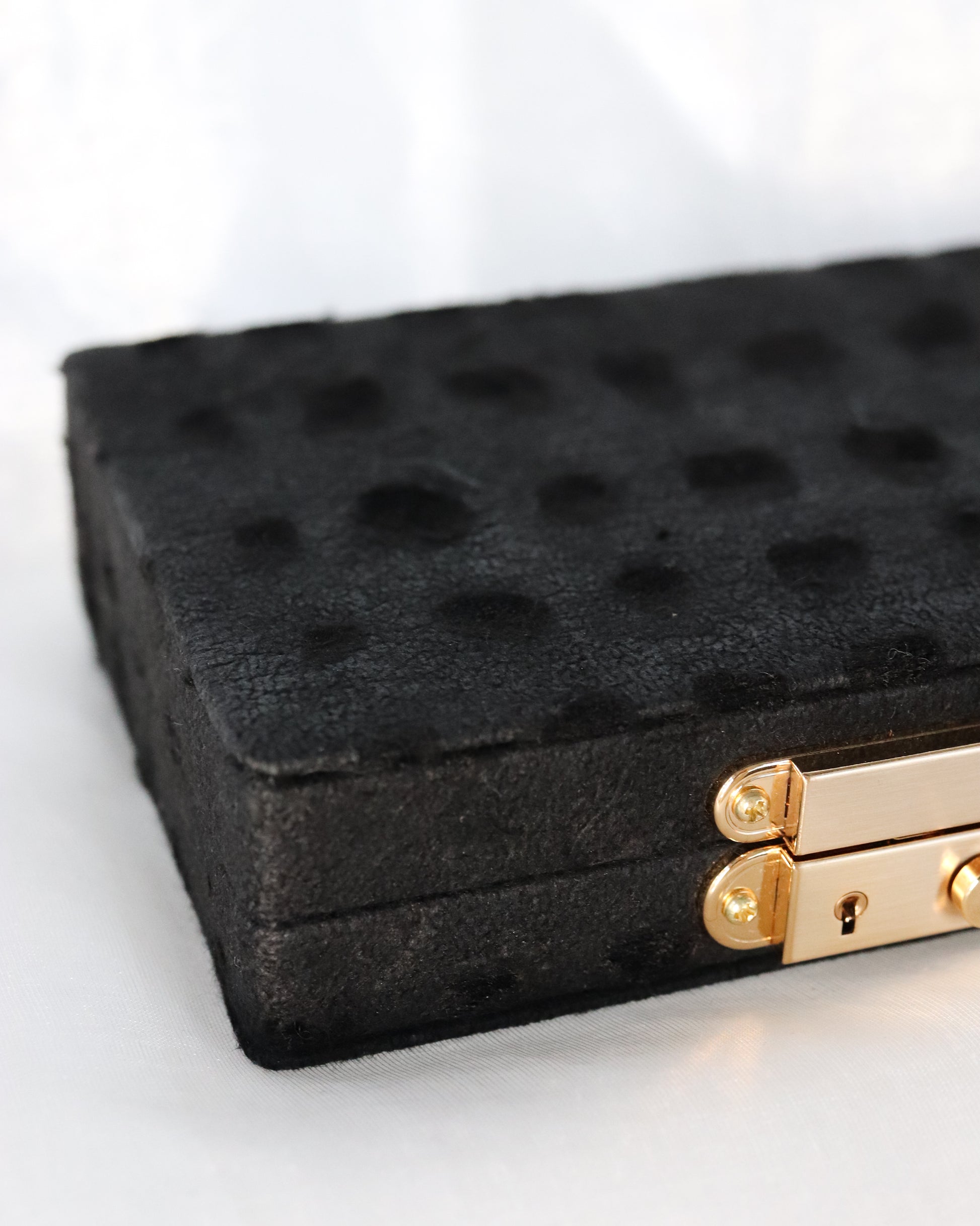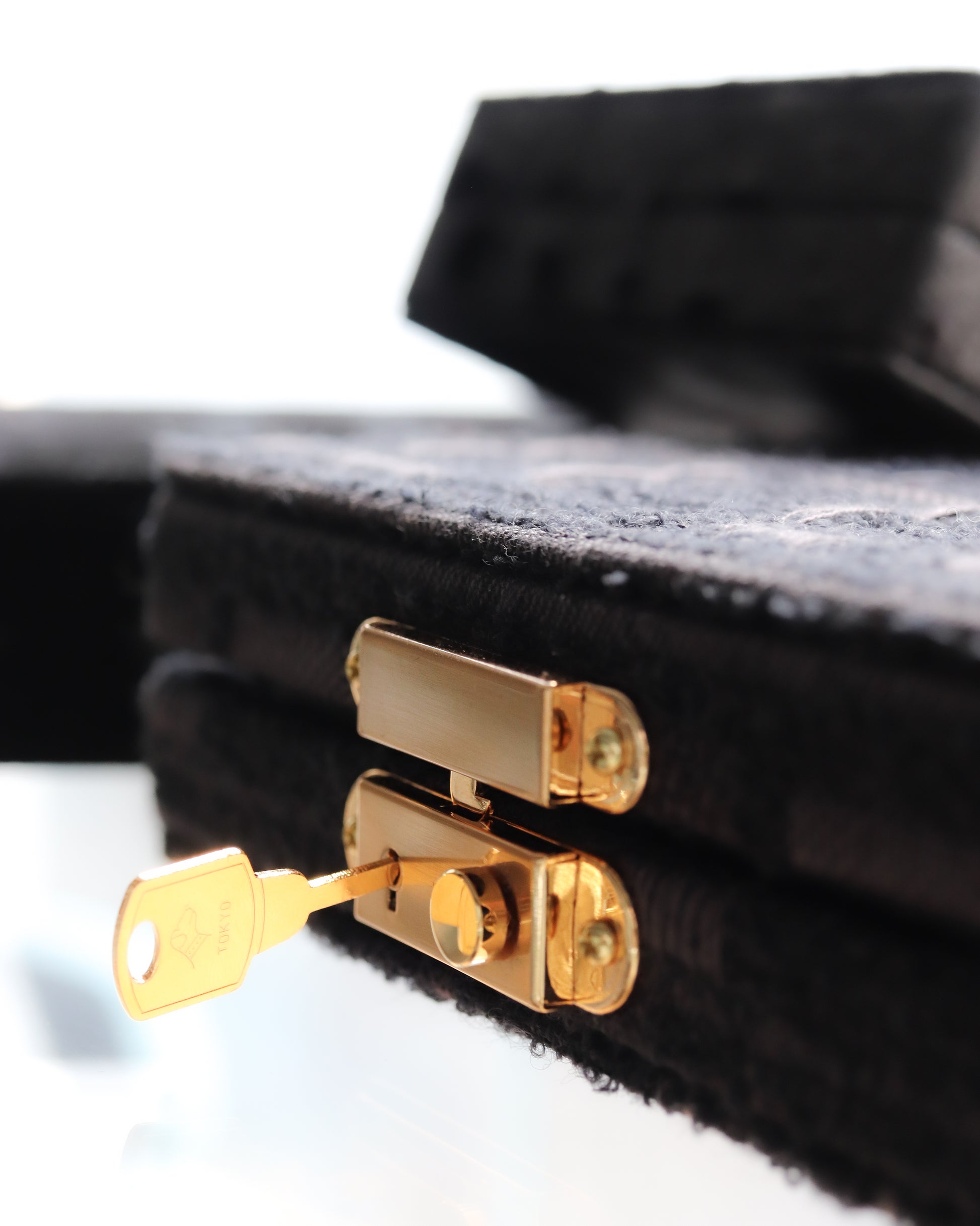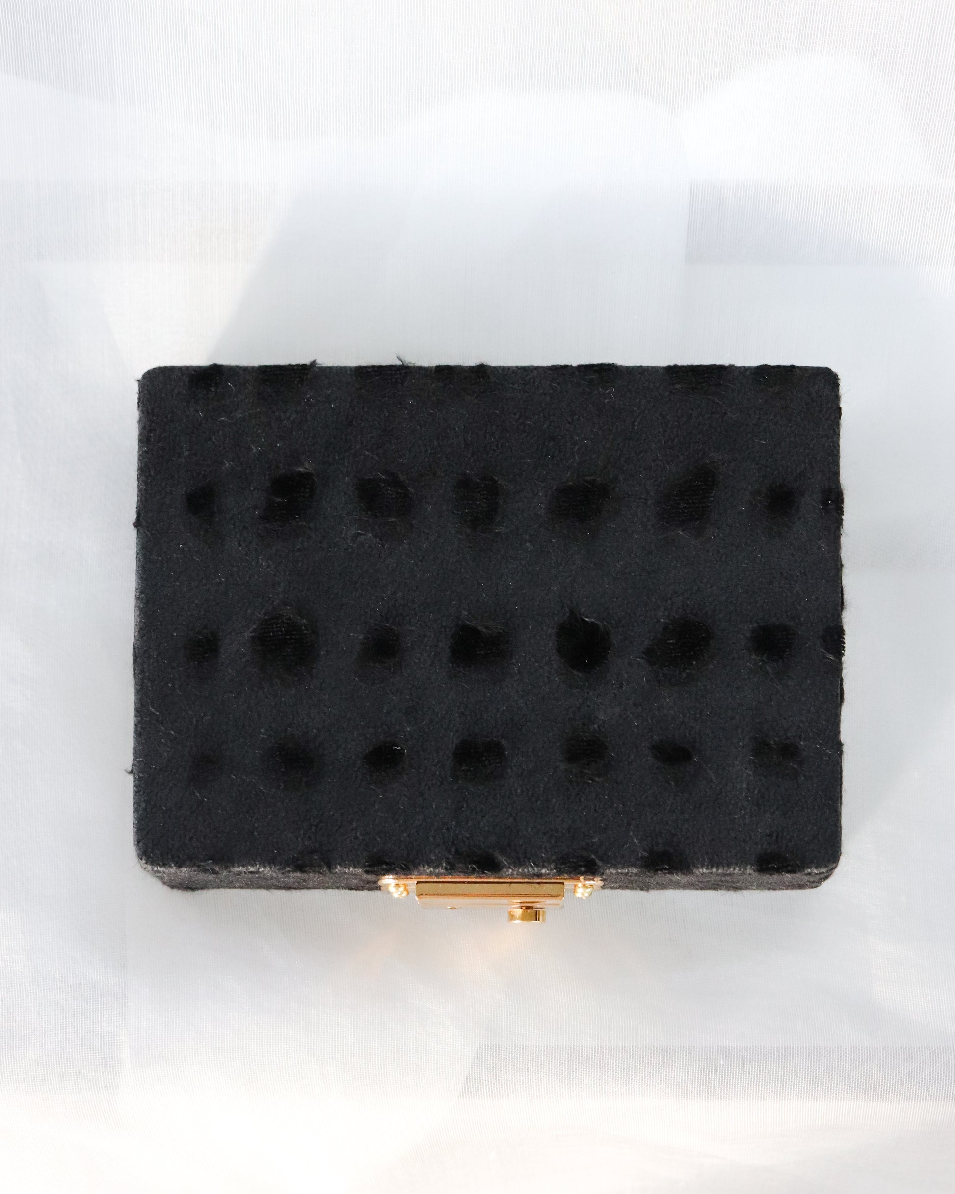 The reverse side of the velvet is flocked (a technique that uses static electricity to attach short fibers) to create a "two-faced" fabric that can be used beautifully on both sides. Since it's attached to a box this time, only one side can be seen, but the scattered dots have an organic, warm feel, as if each dot was carefully painted with a brush. The pattern and appearance, reminiscent of a work of art, add depth to the appearance of the jewelry box.