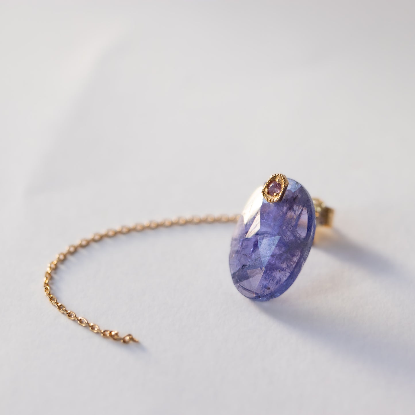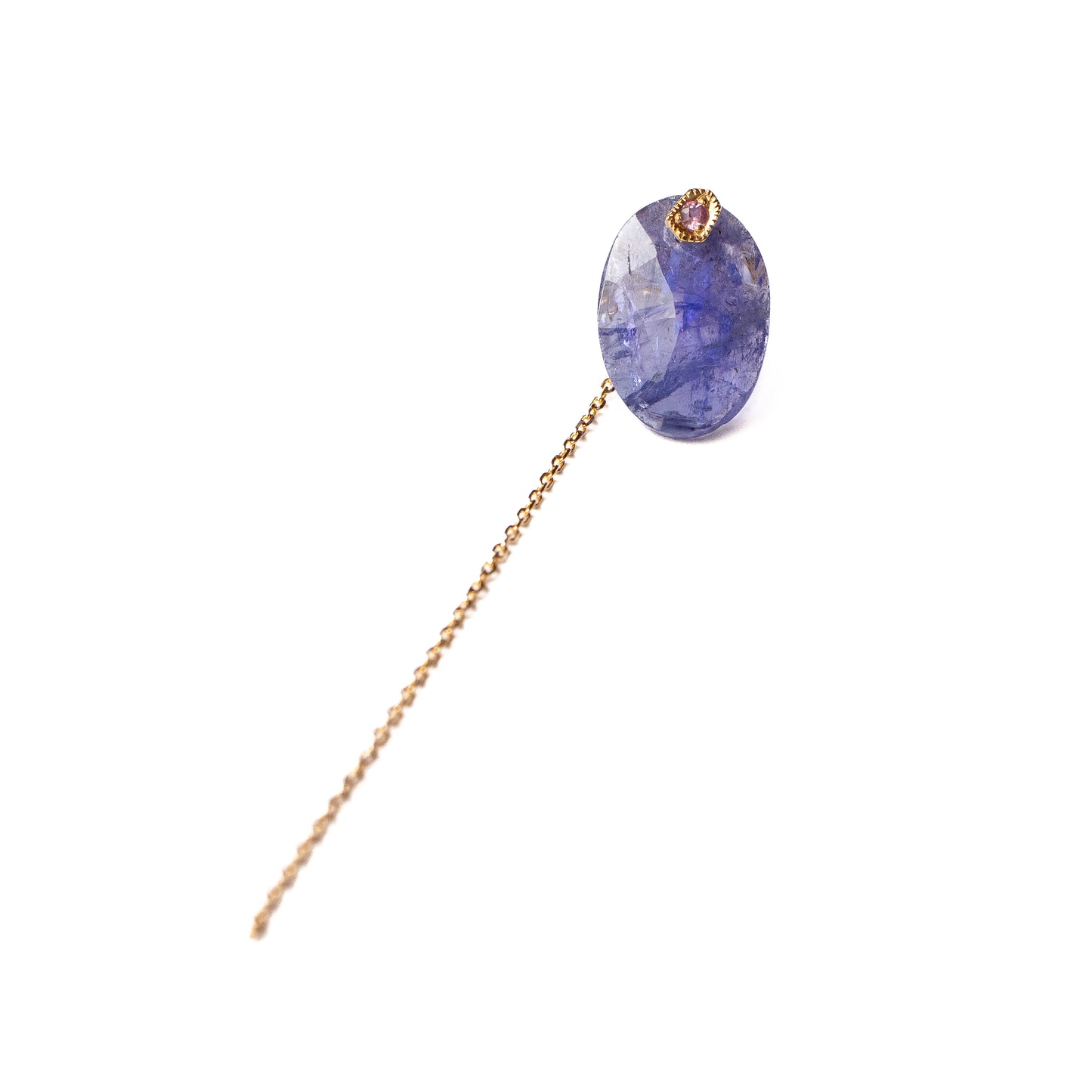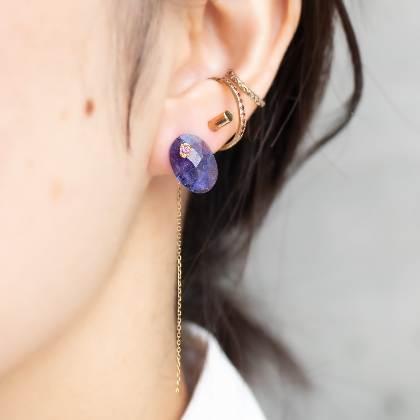 The stone is removable, so you can use it simply with the sapphire post and the backing with the chain, or you can use the backing with other earrings. The cut of the stone is different on the front and back, so it is a versatile design. You can enjoy three different expressions.