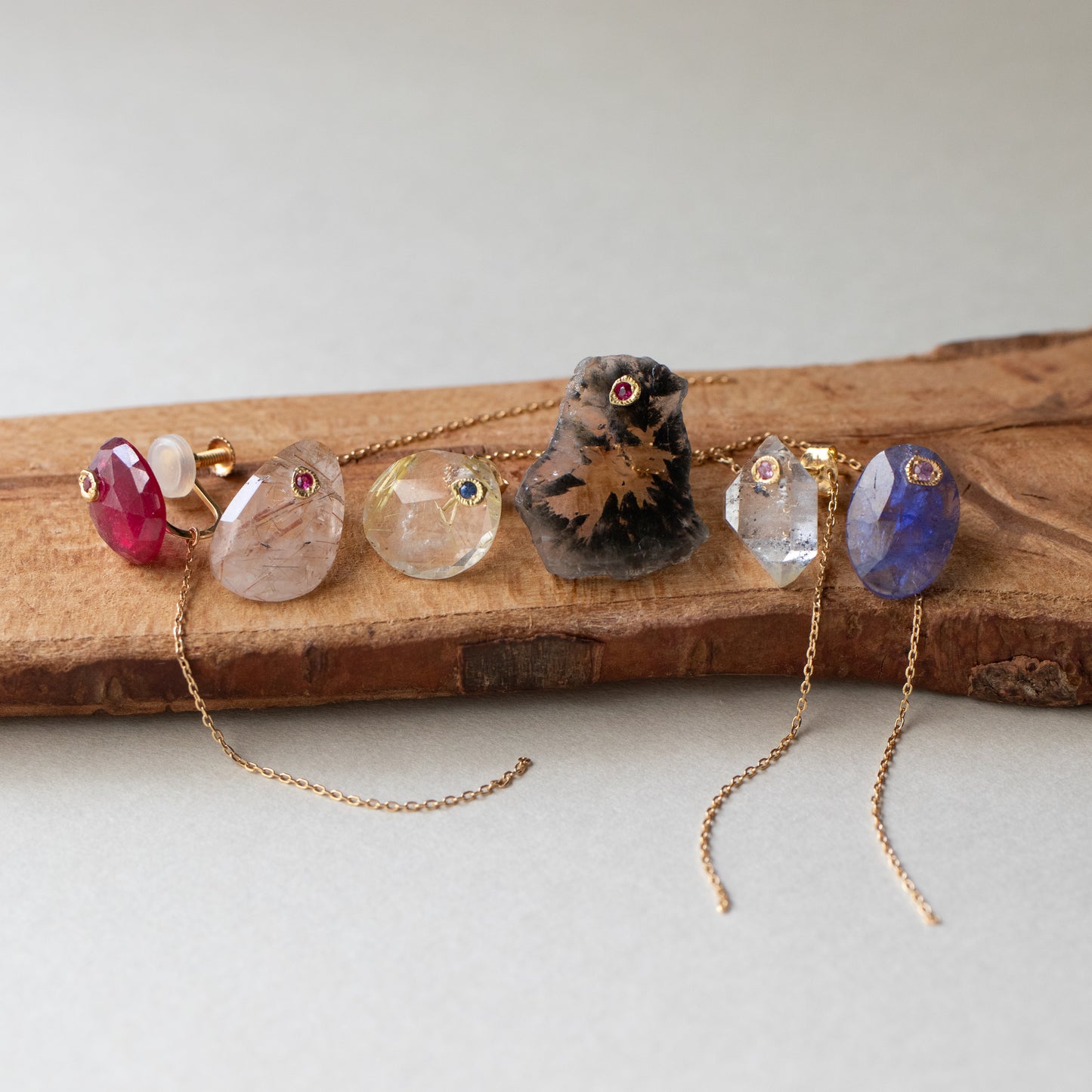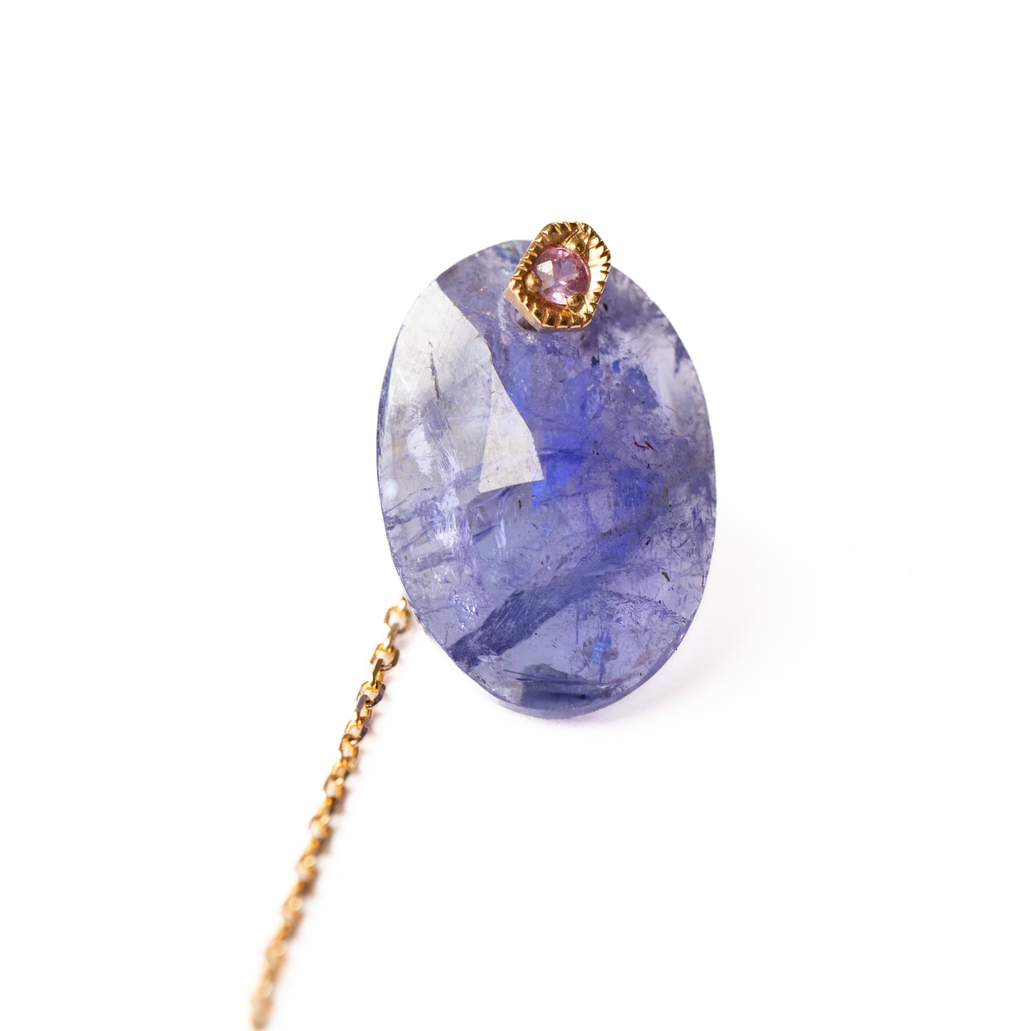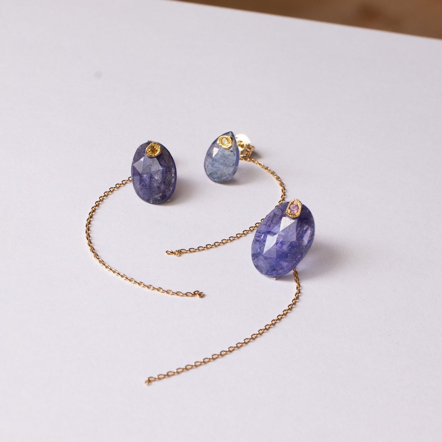 The stone is removable, so you can use it simply with the sapphire post and the backing with the chain, or you can use the backing with other earrings. The cut of the stone is different on the front and back, so it is a versatile design. You can enjoy three different expressions.