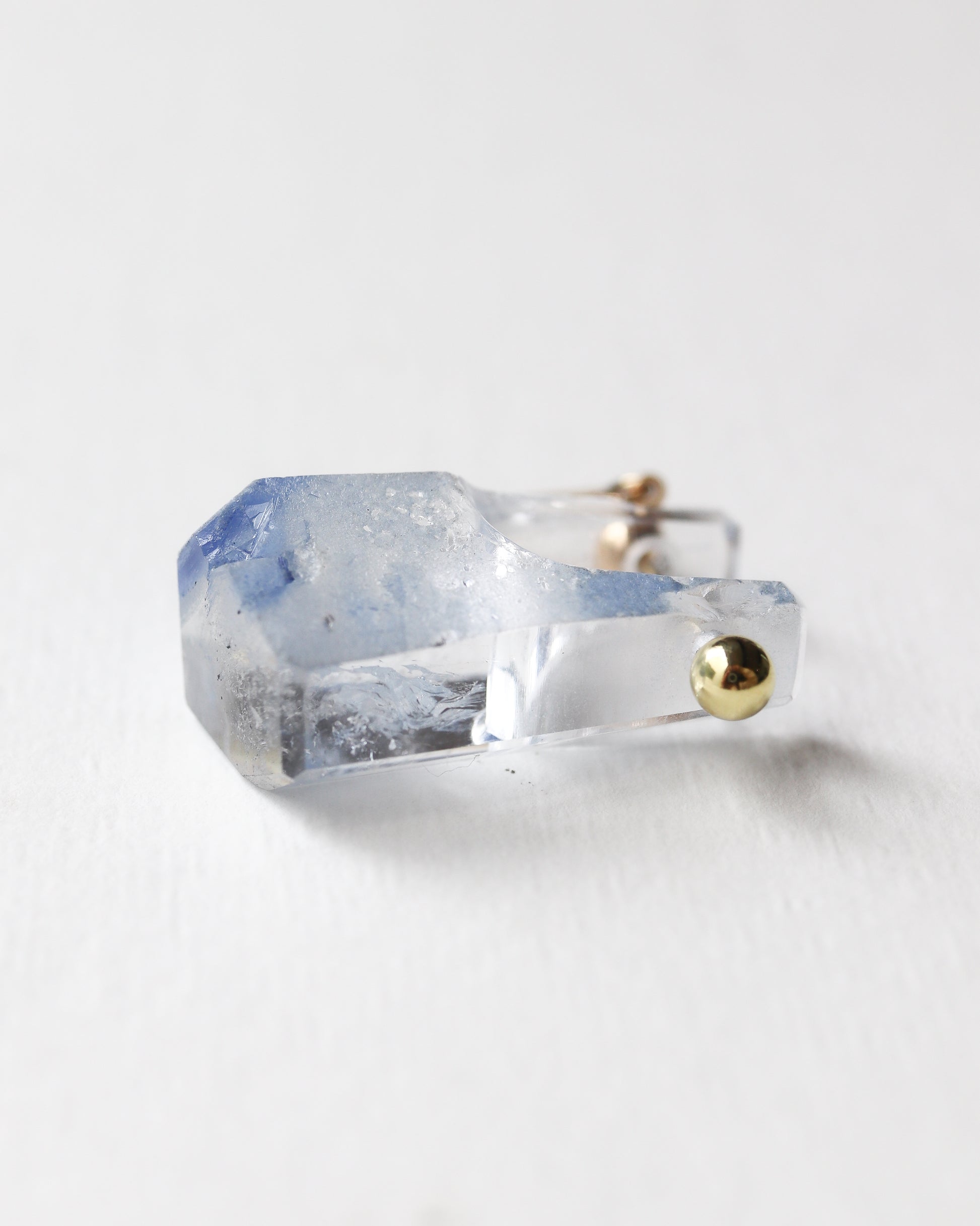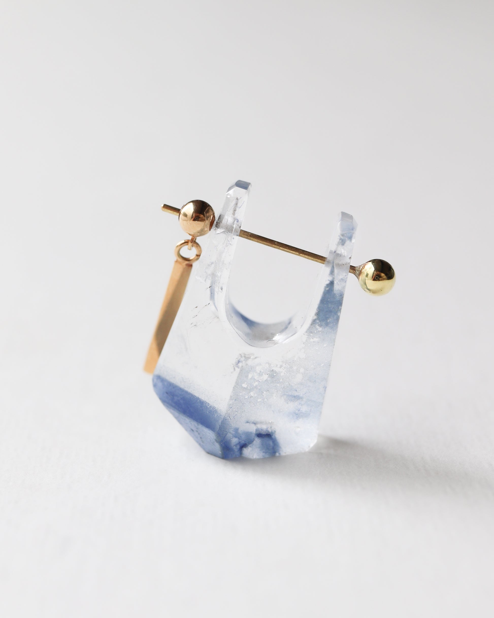 天然石の原石をそのままピアスにしたデザインは、同じ形が無くすべてが1点物。U字の石を耳たぶを挟むようにしてピアスのポストバーを通し、横顔も印象的に演出します。ポストを通す穴の位置を変えて、表裏どちらの面もお楽しみください。