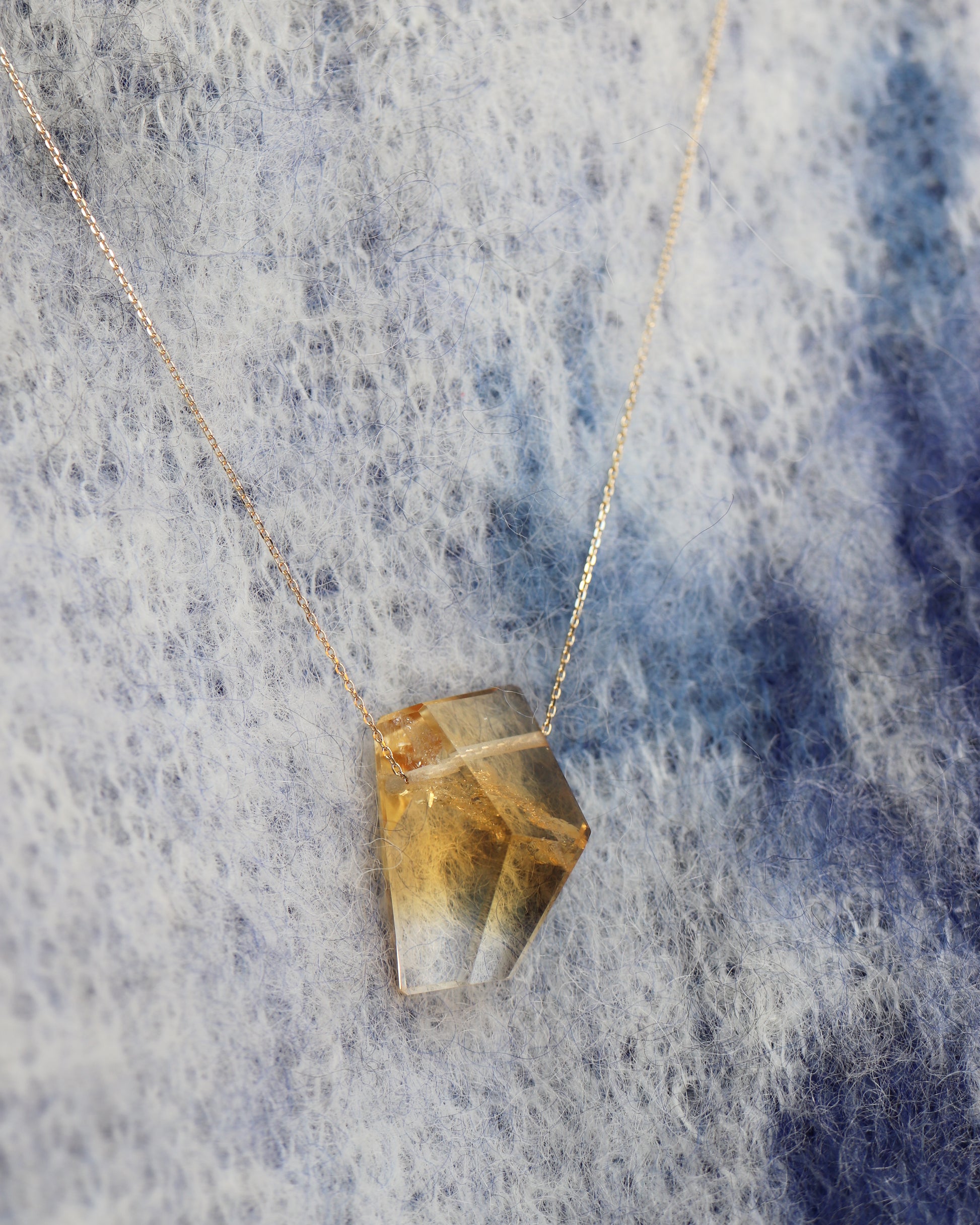 天然石を贅沢な大きさで使用したRockネックレス。クラックやインクルージョンをその石の個性と捉え、石枠を使用せずに最大限魅力を引き出したデザインです。チェーンにはさりげなくブランドプレートが付いています。