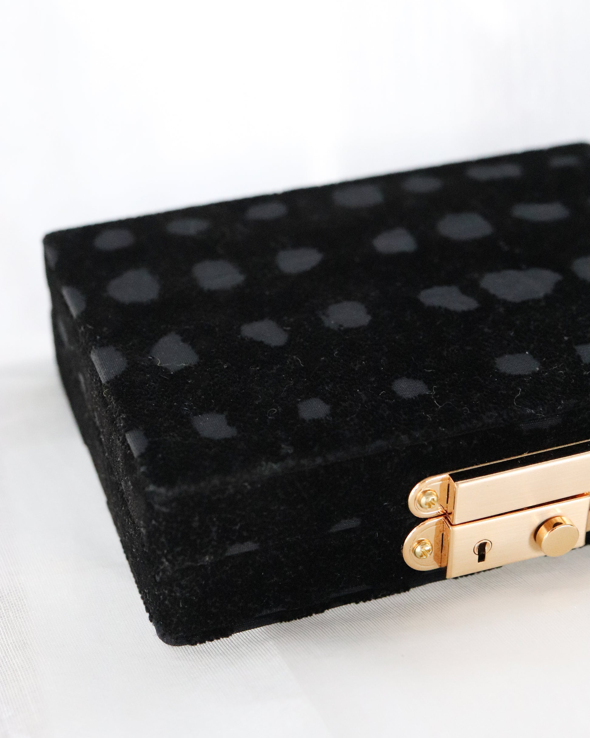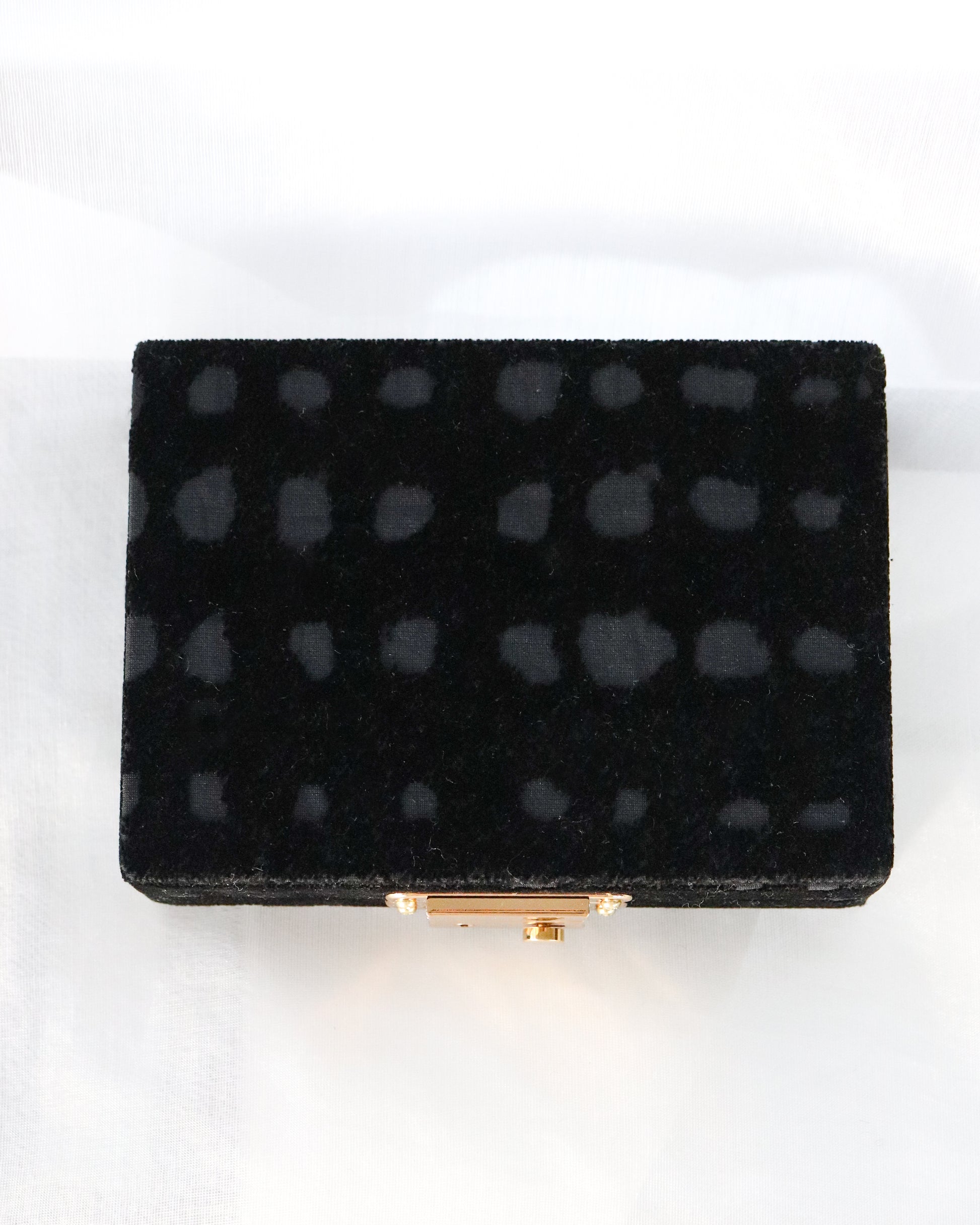 ベルベットの裏側に、フロック加工(短い繊維を静電気で付着させる技法)を施し、表裏どちらも美しく使える“ツー・フェイス”の布地に。今回はボックスに貼っているので片面のみしか見れないですが、まだらに散らばる点模様が有機的で、筆でひとつずつ丁寧に描いたような温かみが漂います。美術作品のような柄や表情は、ジュエリーボックスの佇まいに奥行きを与えてくれます。