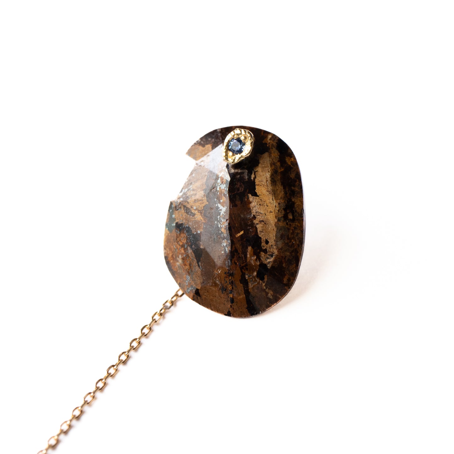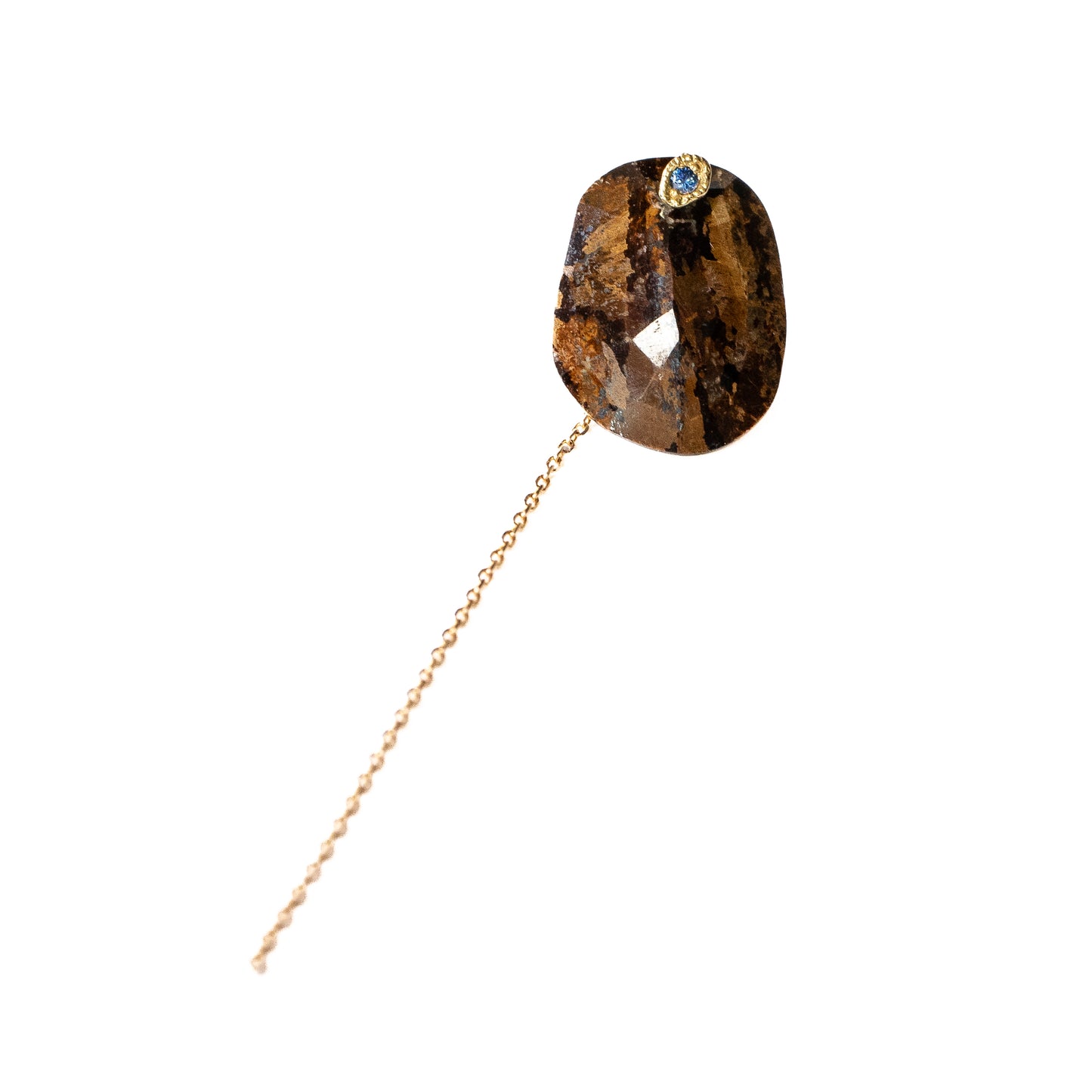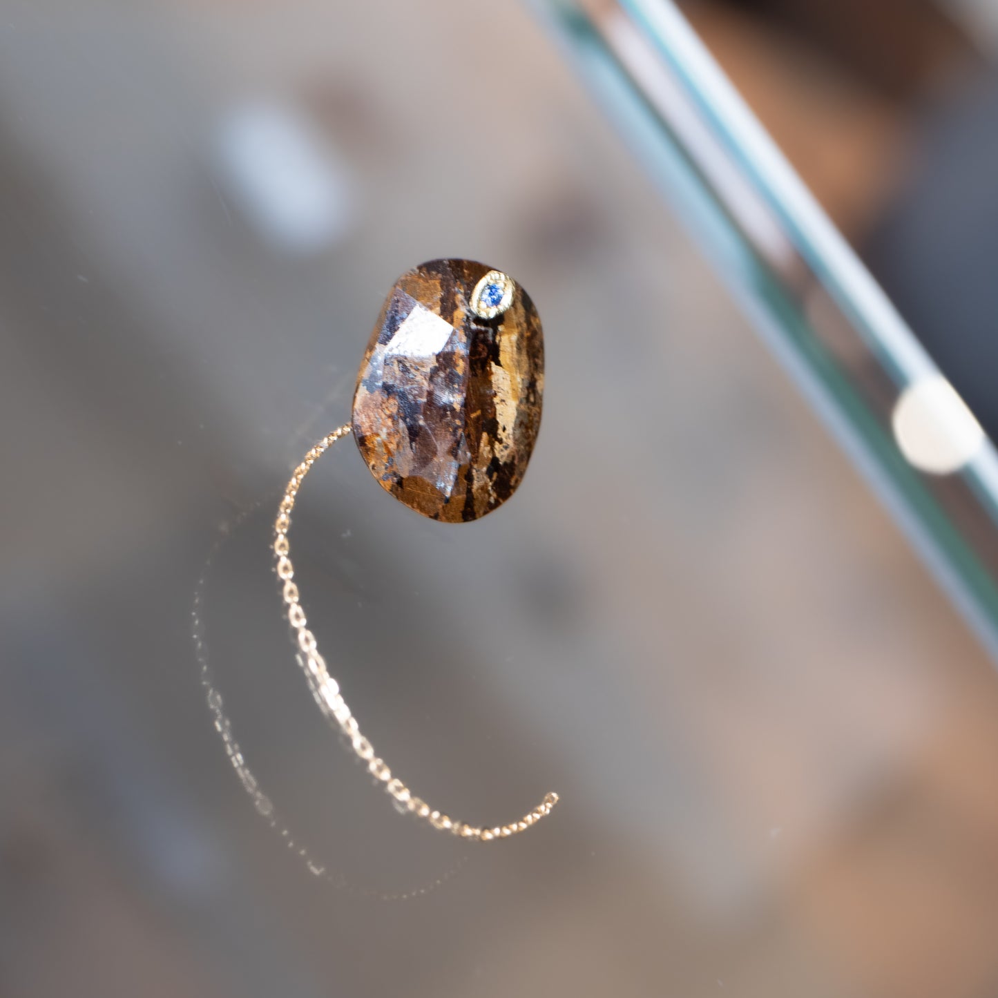 石の取り外しが可能で、サファイアポストとチェーン付きのキャッチだけでシンプルに使用したり、チェーン付きのキャッチを他のピアスにも使用できる汎用性の高いデザインです。石の裏表でカットが異なるので2つの表情が楽しめます。