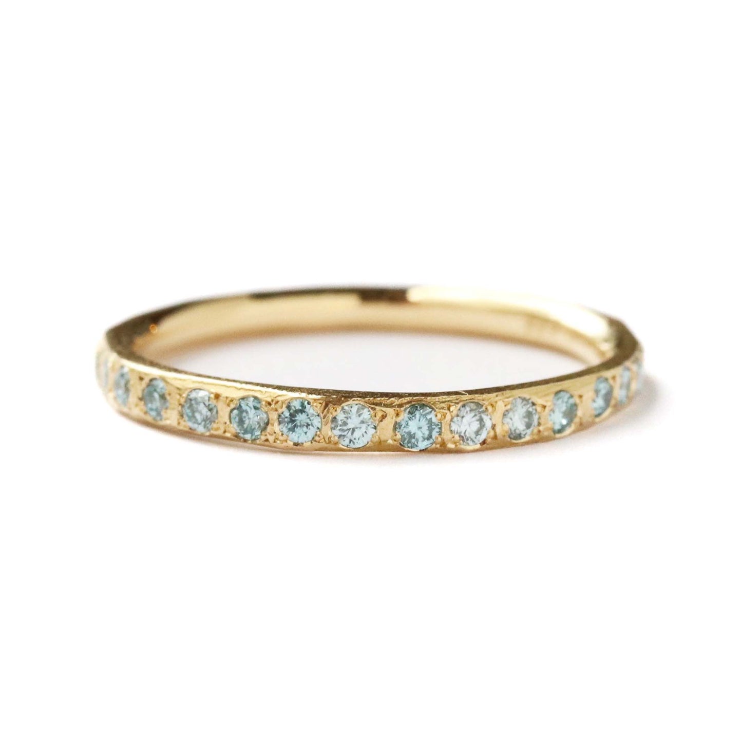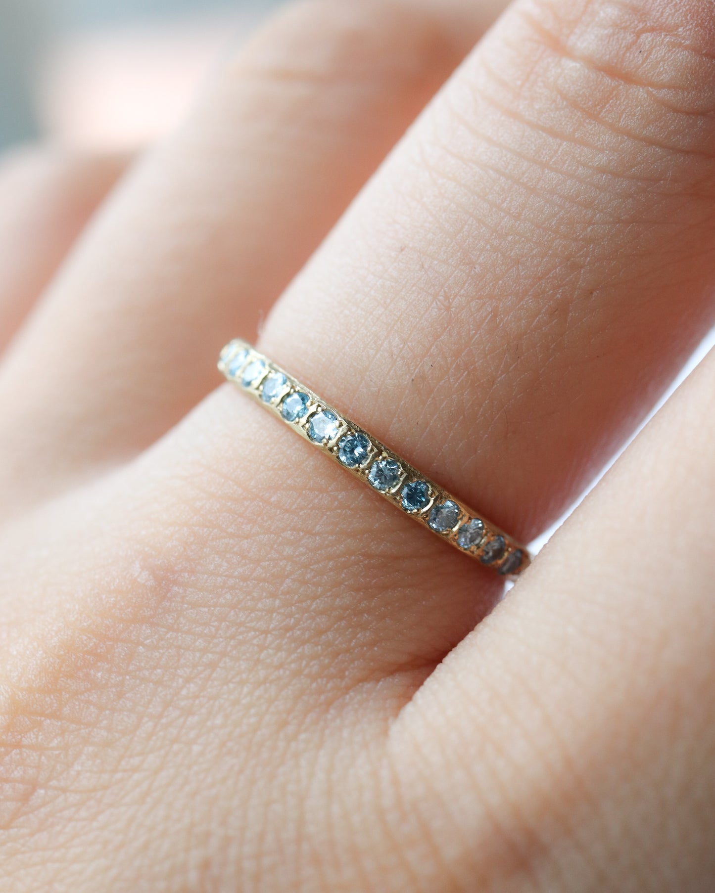 石ごとに表情の違うメレ石を選定し、丁寧に留めを施したリング。