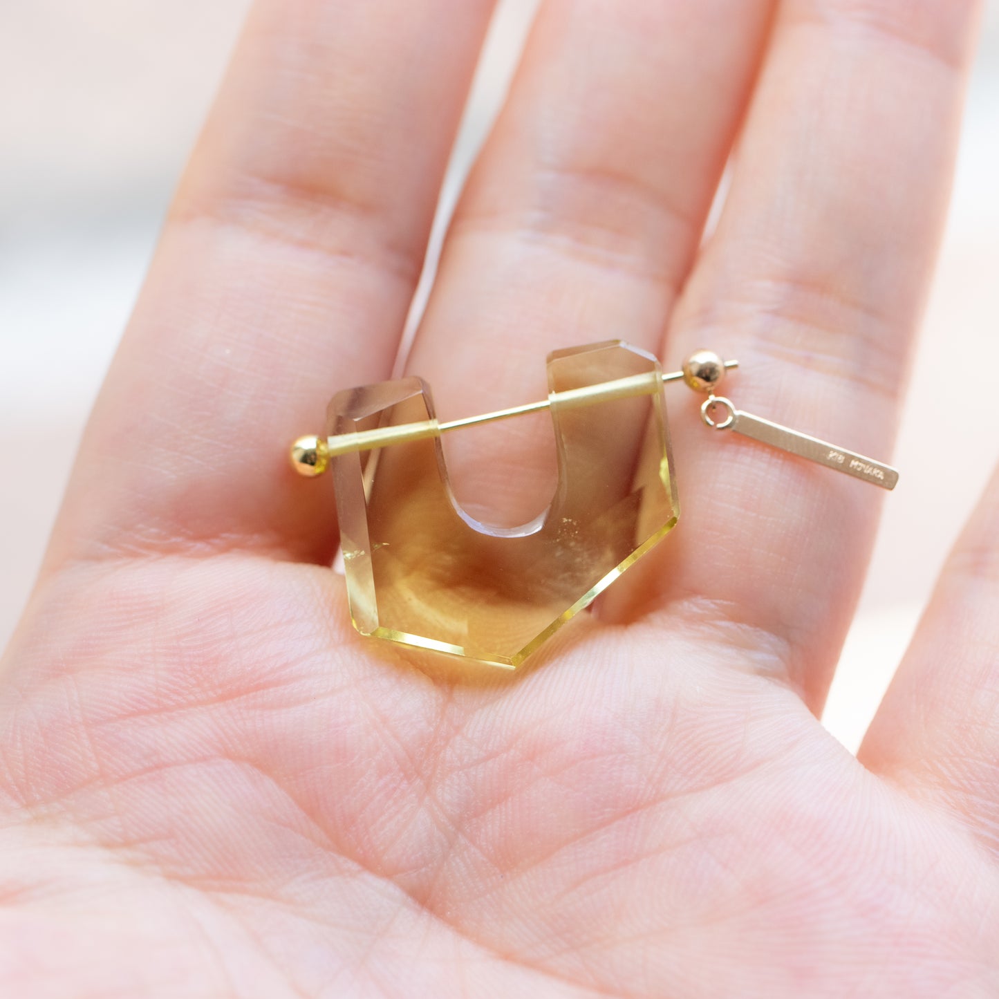 天然石の原石をそのままピアスにしたデザインは、同じ形が無くすべてが1点ものです。U字の石を耳たぶを挟むようにしてピアスのポストバーを通し、横顔も印象的に演出します。パーツもMONAKA jewelleryオリジナルで作製し、他にはないデザインが個性的で新しい印象のピアスです。