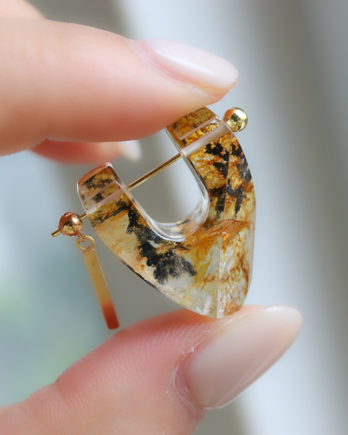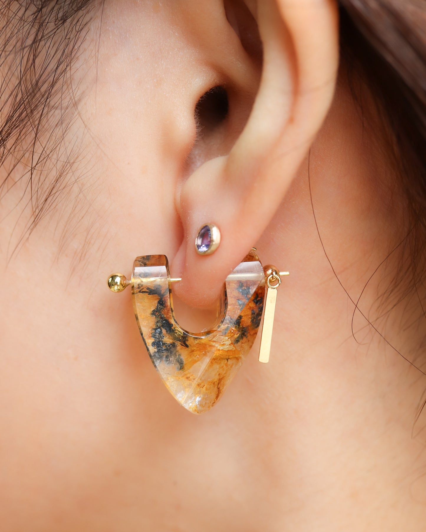 天然石の原石をそのままピアスにしたデザインは、同じ形が無くすべてが1点ものです。U字の石を耳たぶを挟むようにしてピアスのポストバーを通し、横顔も印象的に演出します。パーツもMONAKA jewelleryオリジナルで作製し、他にはないデザインが個性的で新しい印象のピアスです。