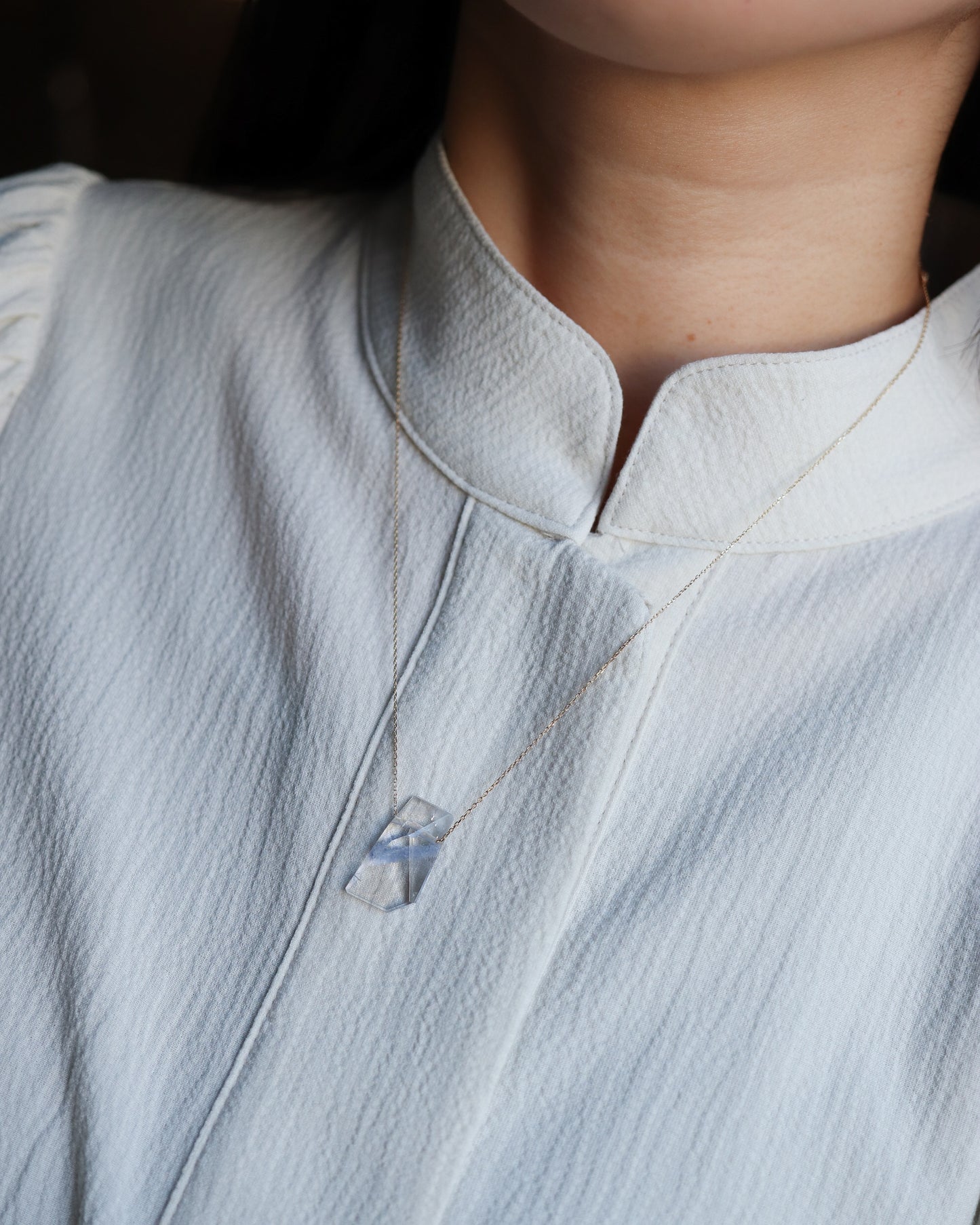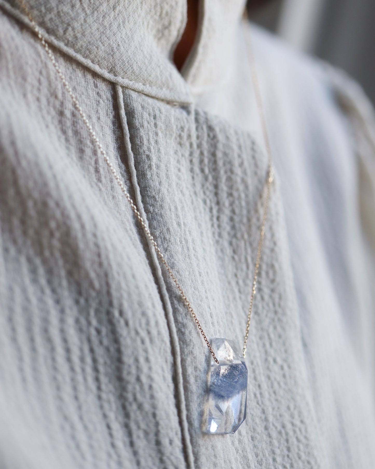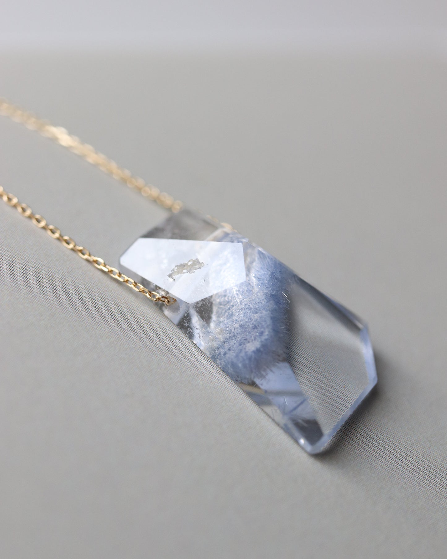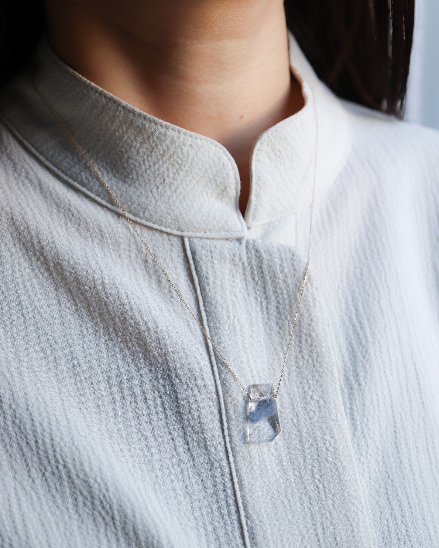 天然石を贅沢な大きさで使用したRockネックレス。クラックやインクルージョンをその石の個性と捉え、石枠を使用せずに最大限魅力を引き出したデザインです。チェーンにはさりげなくブランドプレートが付いています。