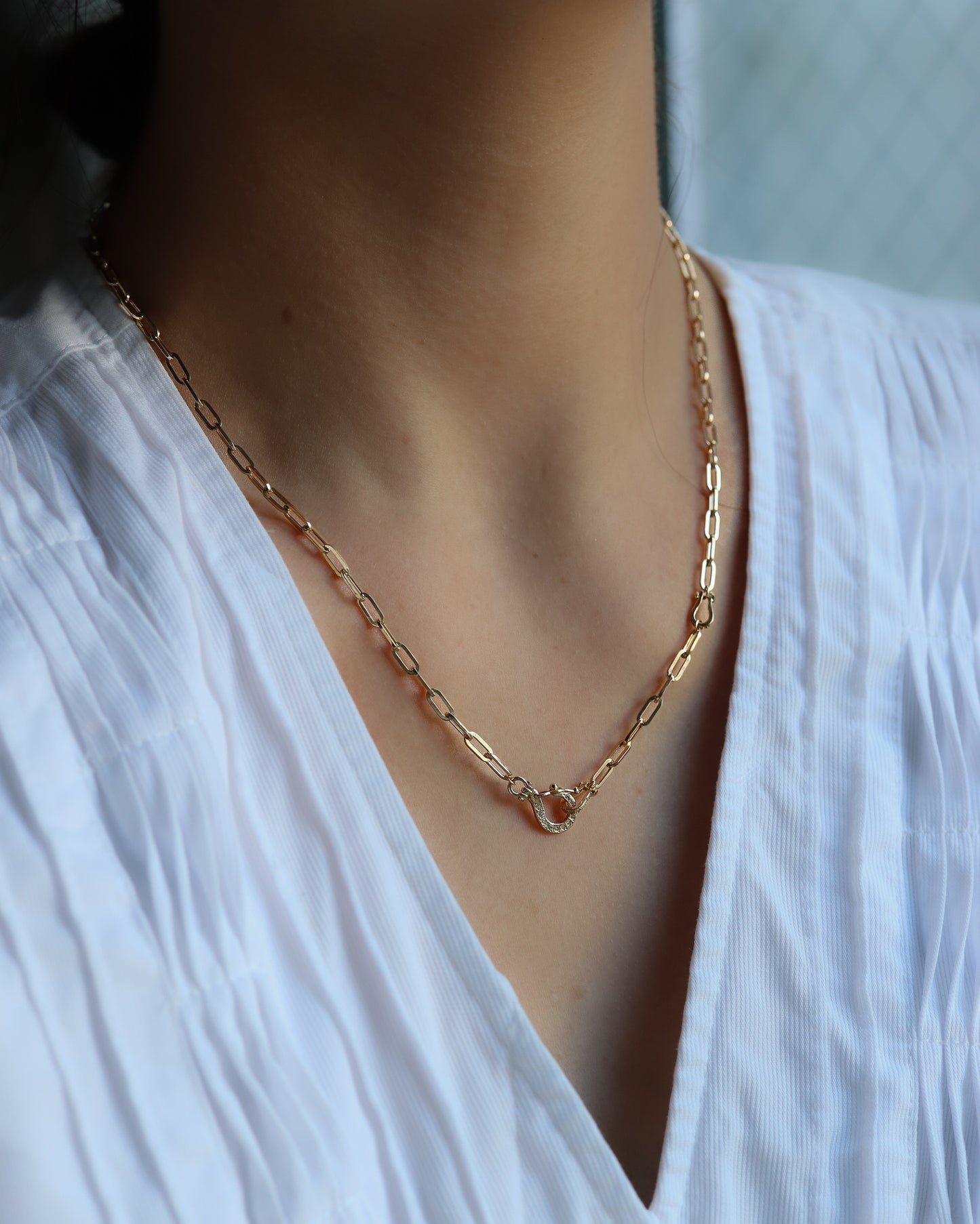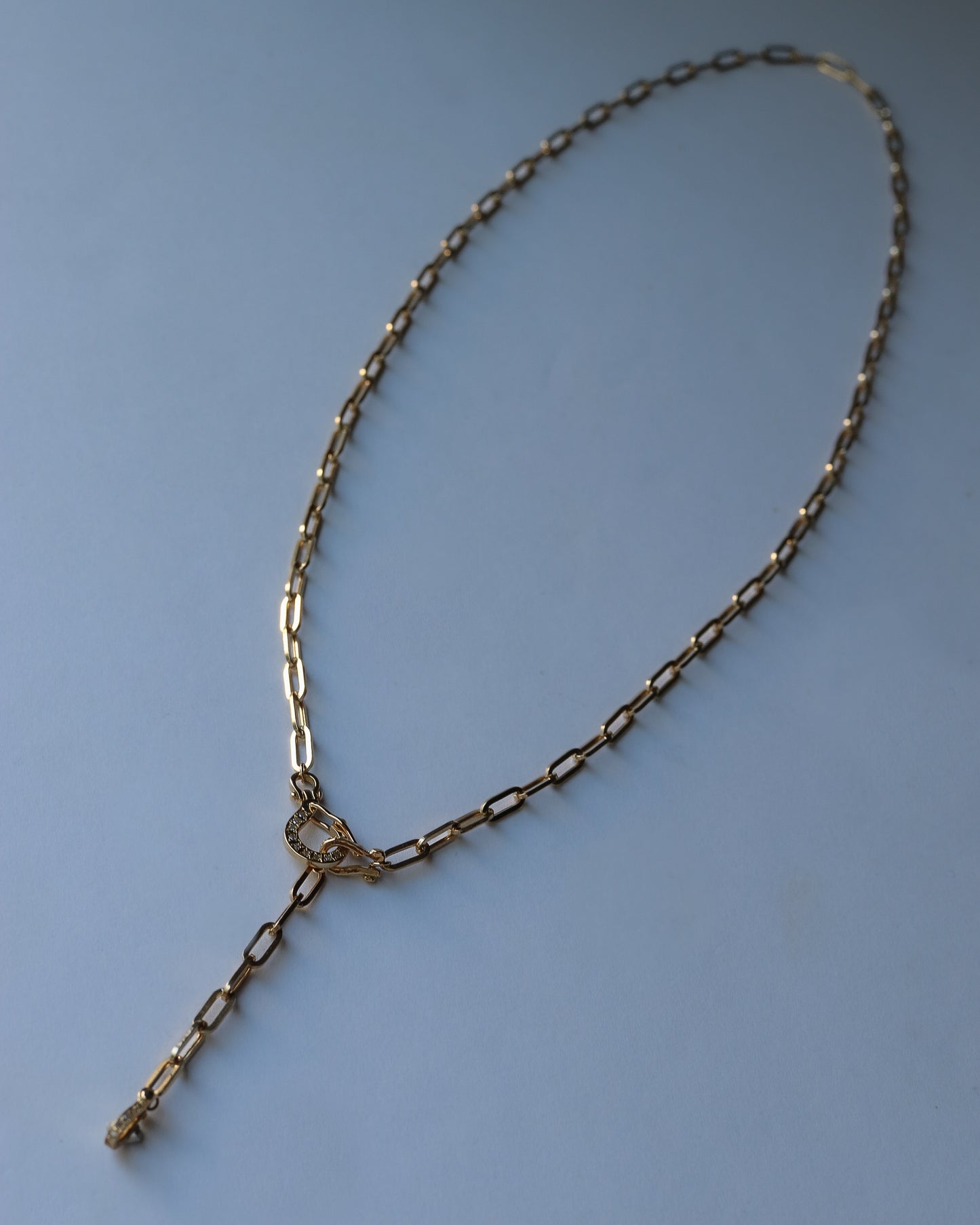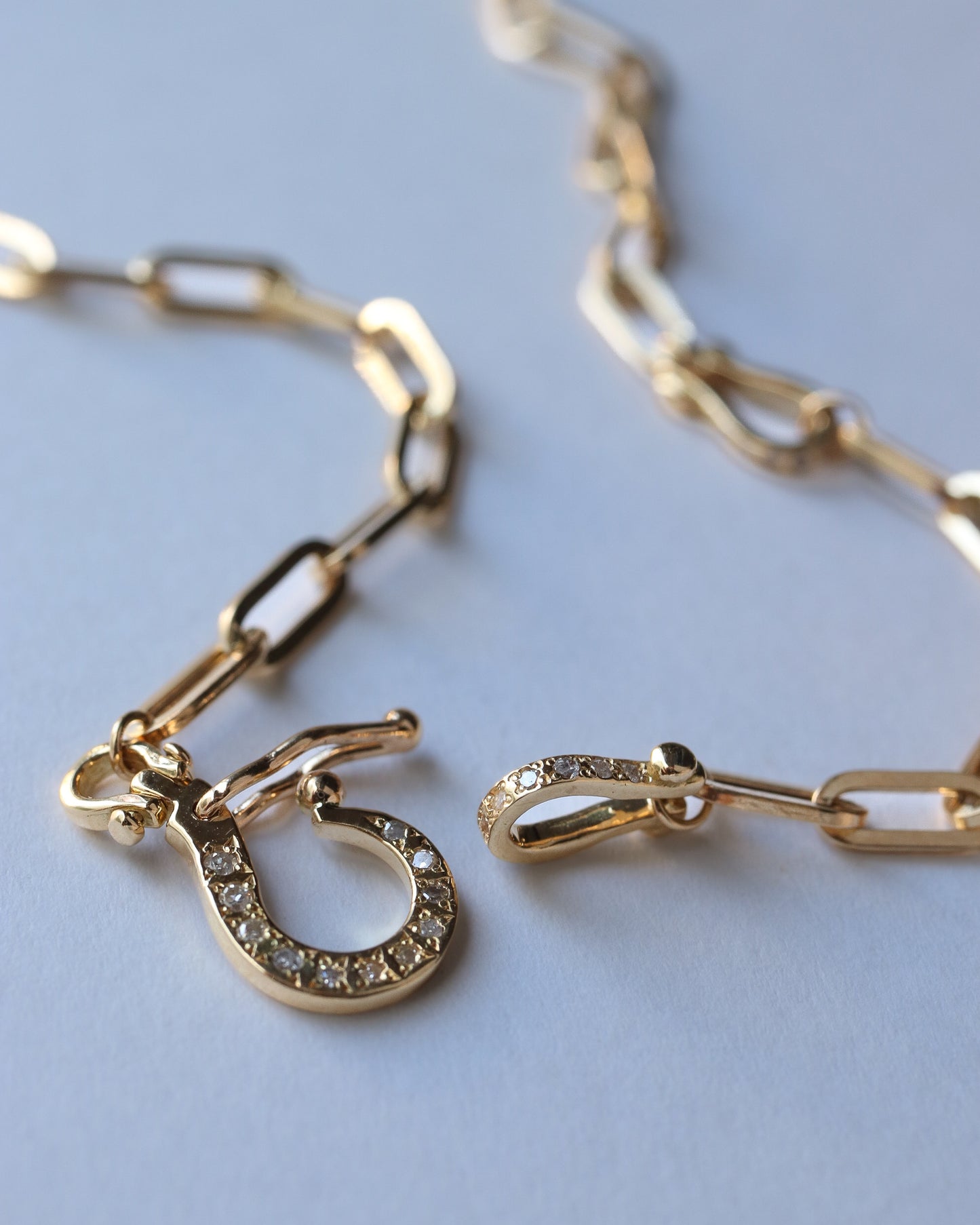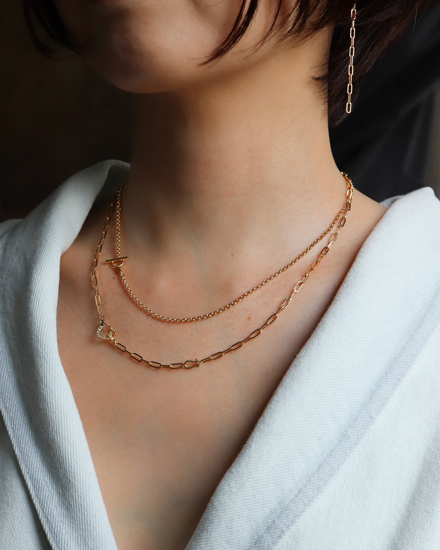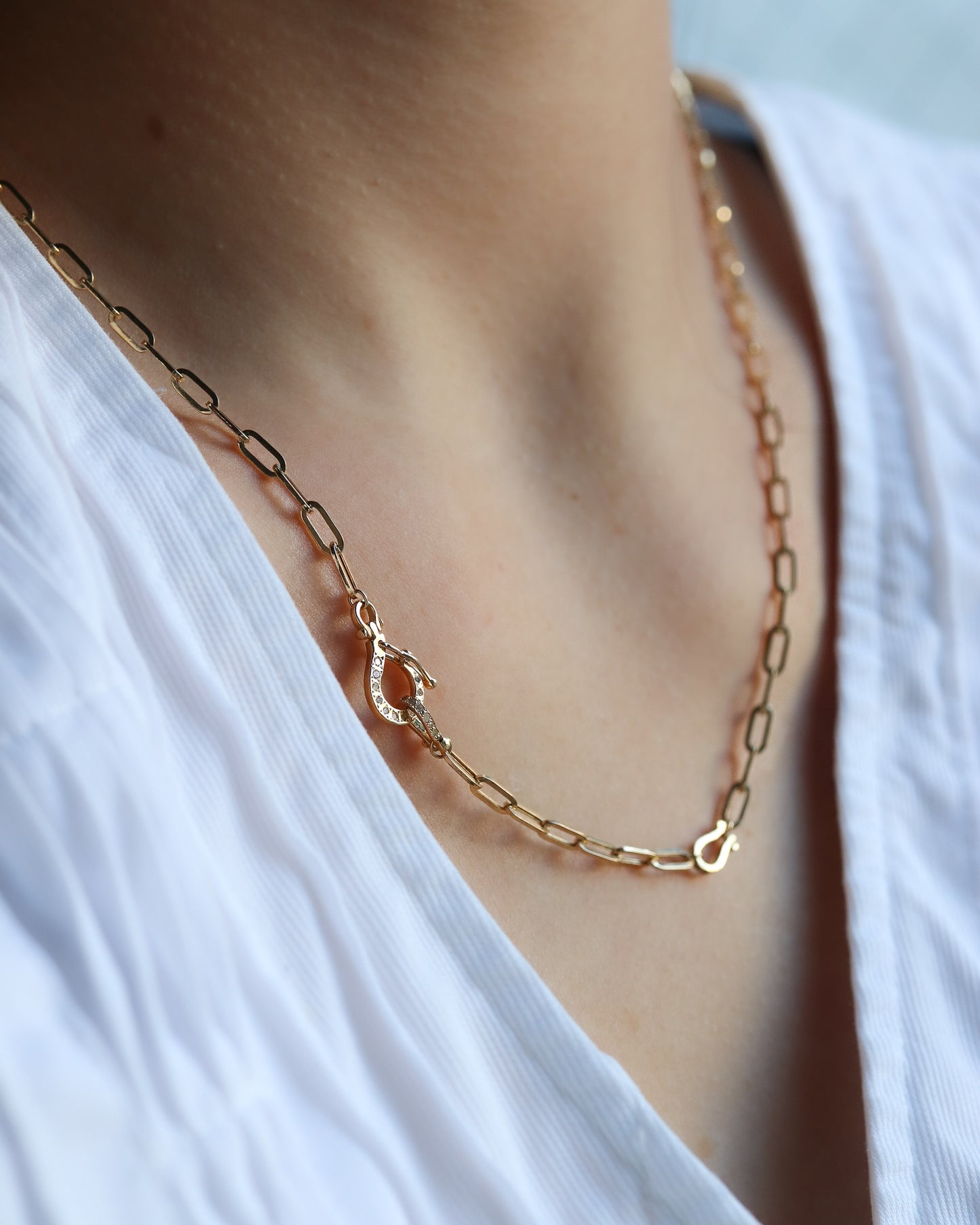 Link Necklaceは通常のネックレスに見られる引き輪パーツを設けず、MONAKAオリジナルの開閉式モチーフをセッティング。