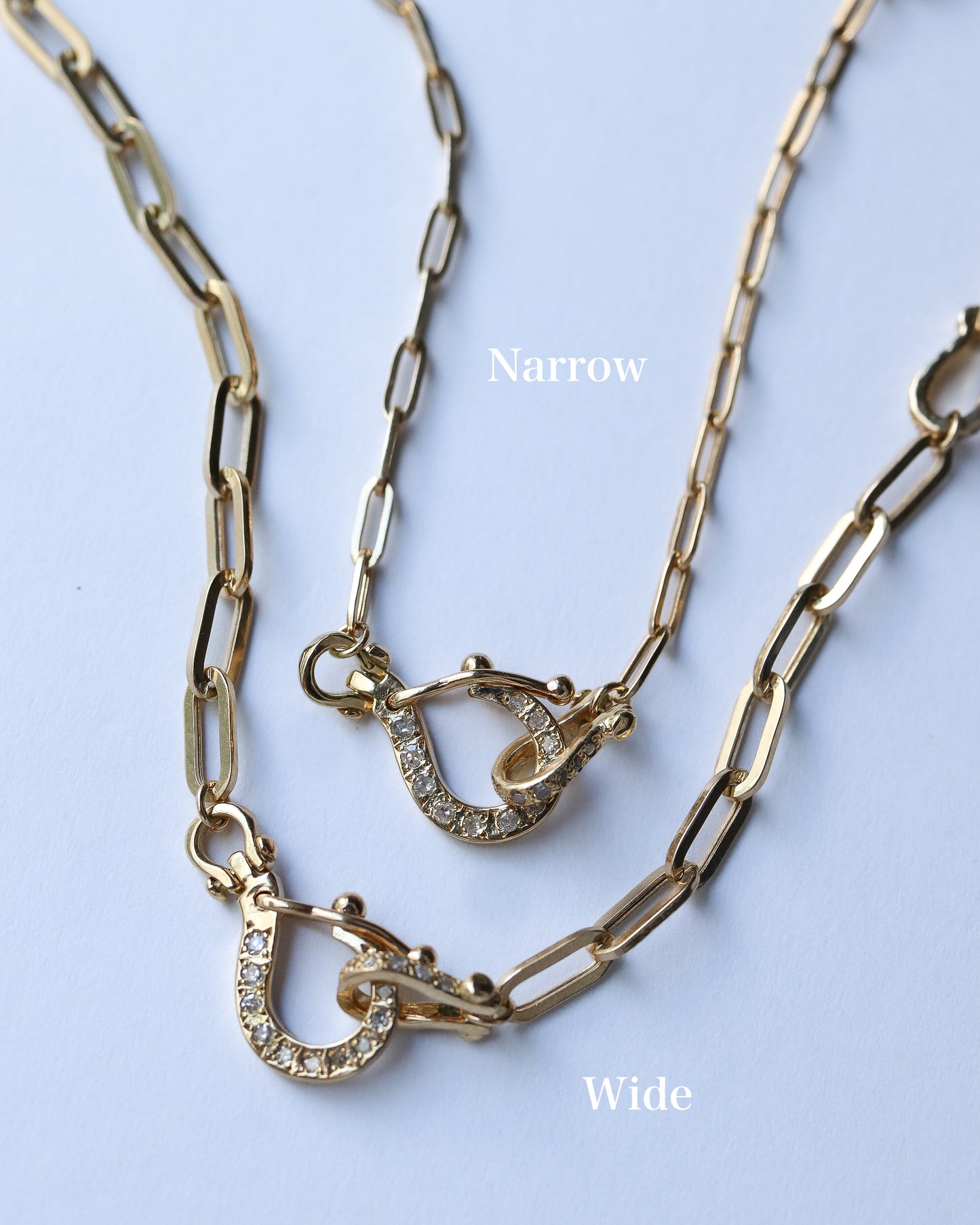 NarrowはWideに比べ少し細めのチェーンが特徴。軽やかに煌めき、コマの合間から肌が見える抜け感や繊細さも兼ね揃えています。*モチーフ部分のサイズは同じです