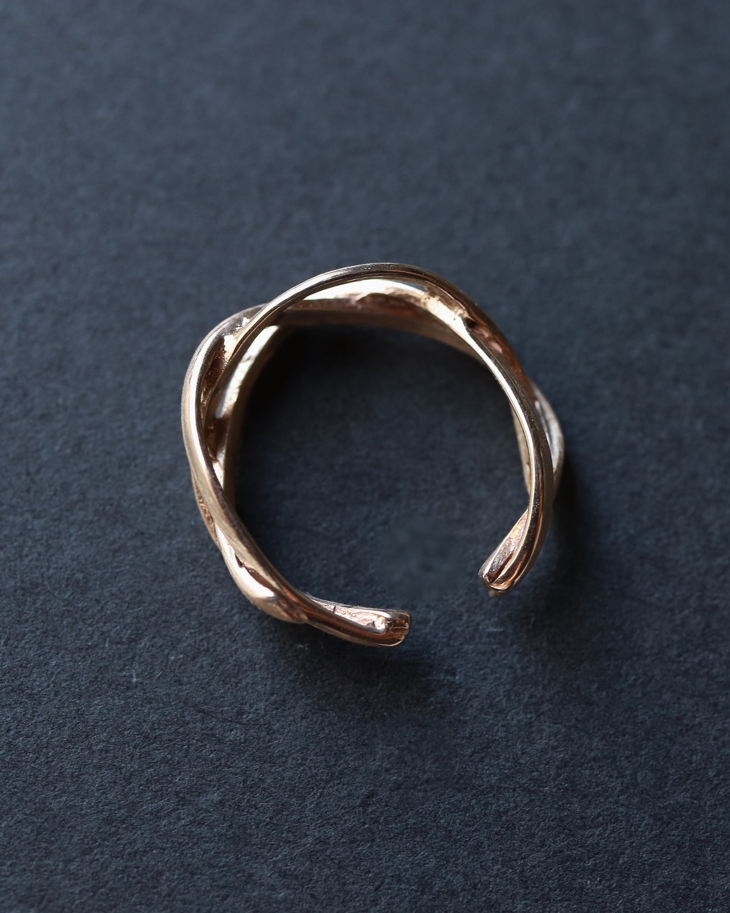 しなやかな動きで編み込まれた地金は、金属の無骨さを感じさせない柔らかな表情を実現しました。贅沢に使われた地金がリッチ感を演出し、繊細に絡む線と線が重厚感と抜け感を楽しませてくれます。