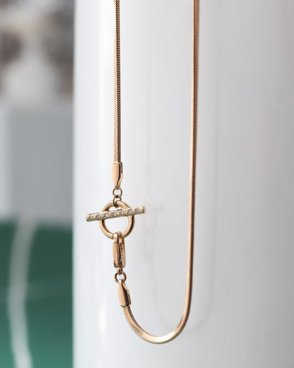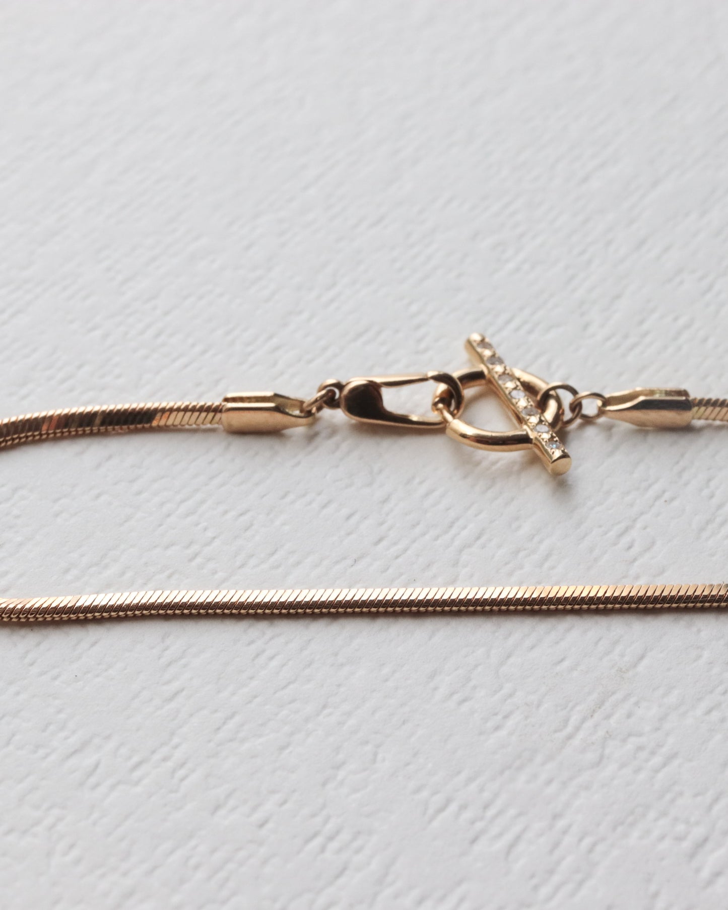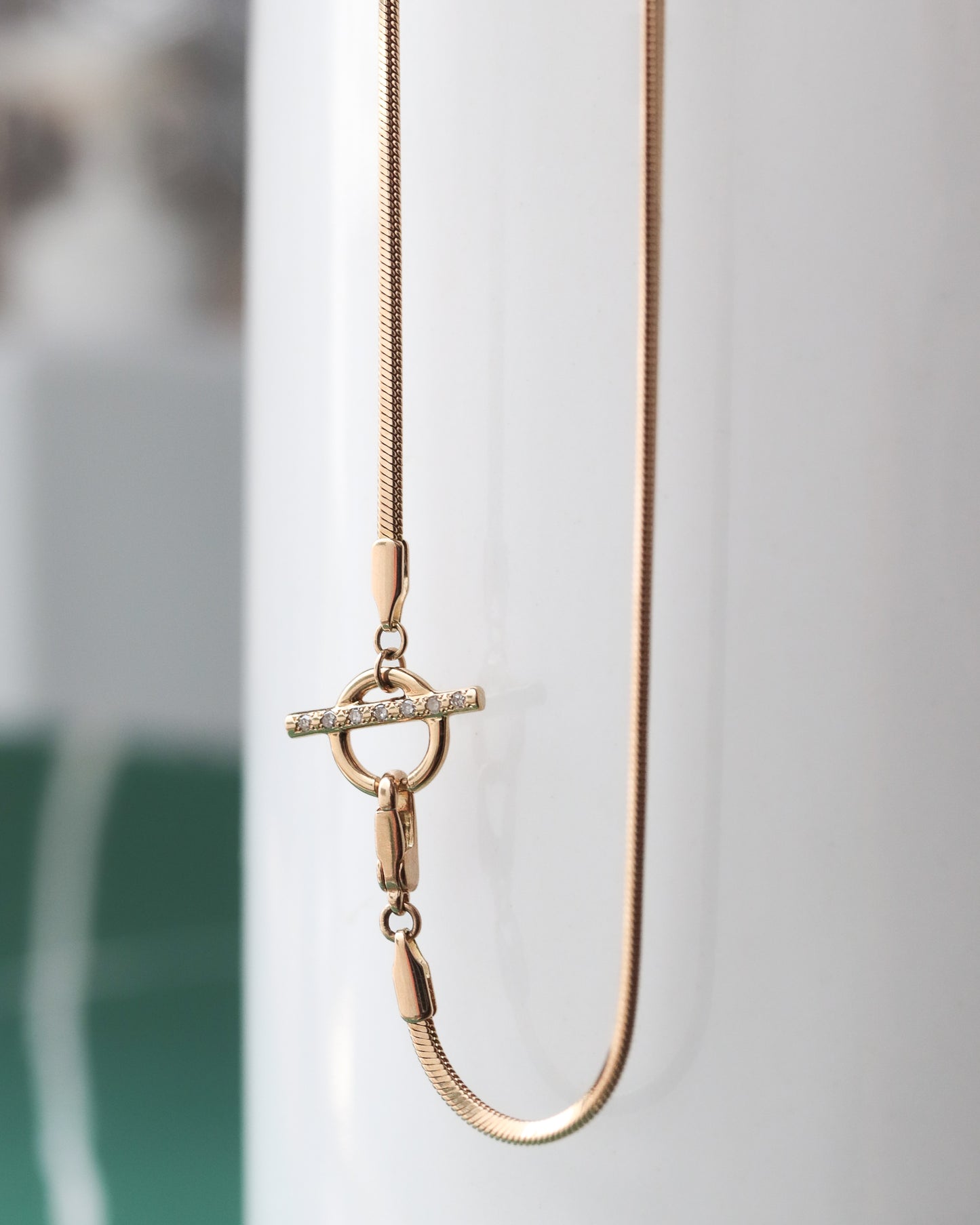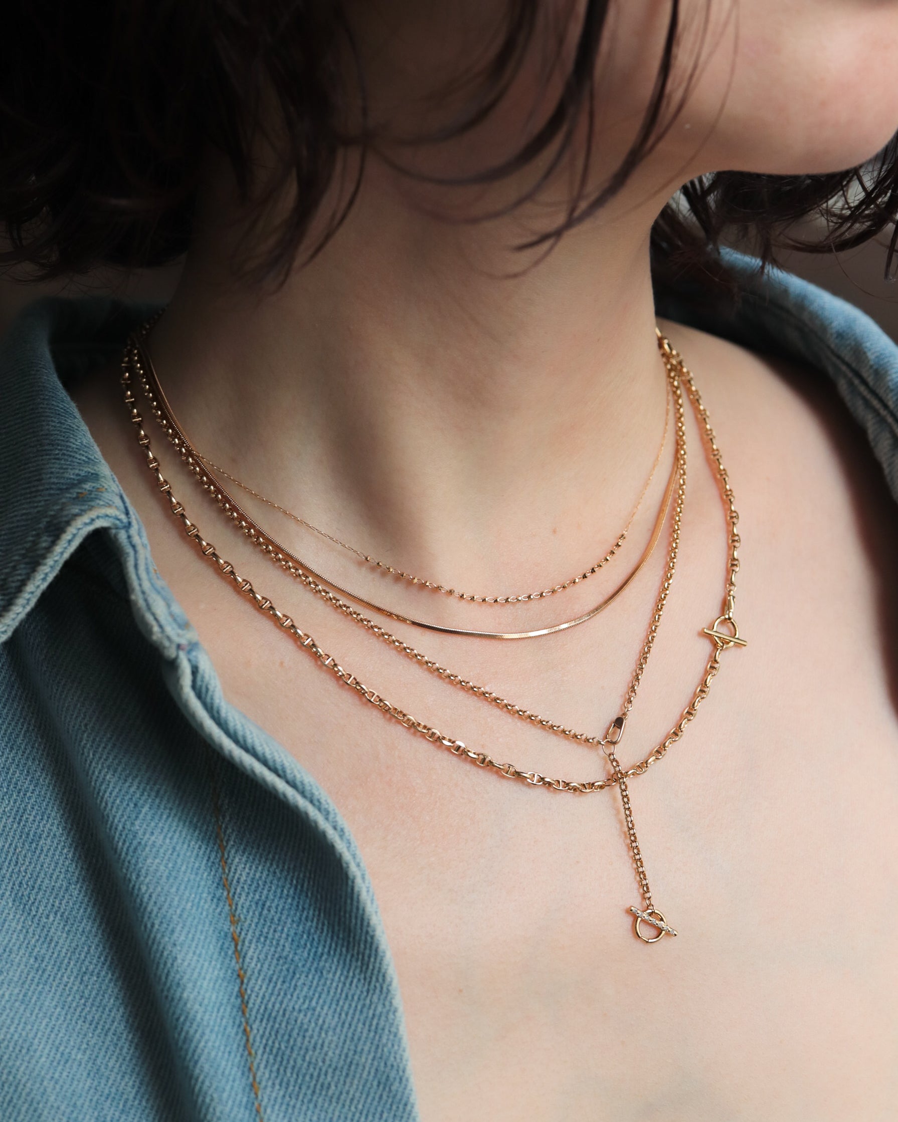 マンテルの本来持つクラスプとしての機能ではなく、デザイン性を重視してモチーフとして使用したシリーズ。チェーンの種類は、スネーク、ハーフランド、アンカーの3種類展開です。それぞれモチーフ部分にキラキラと輝くメレダイアを留め、煌びやかな中にもそっと佇む優しさを表現いたしました。