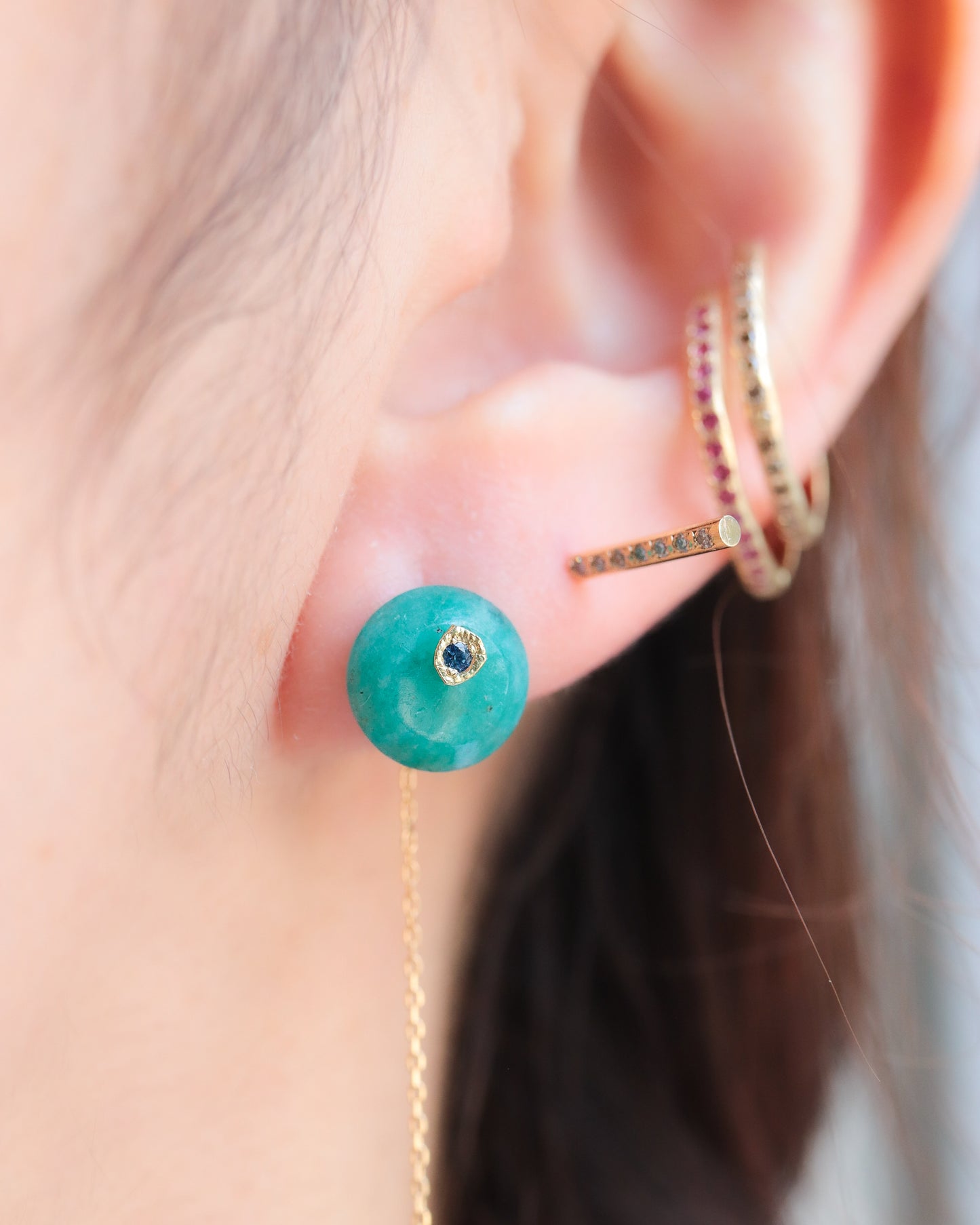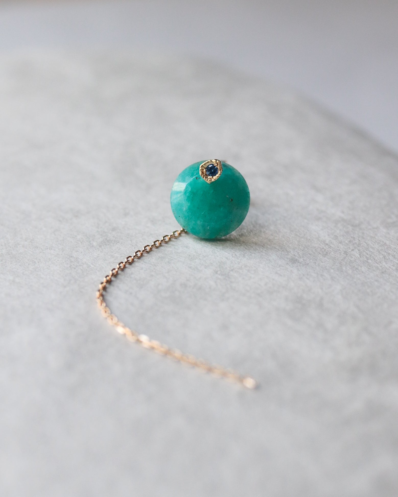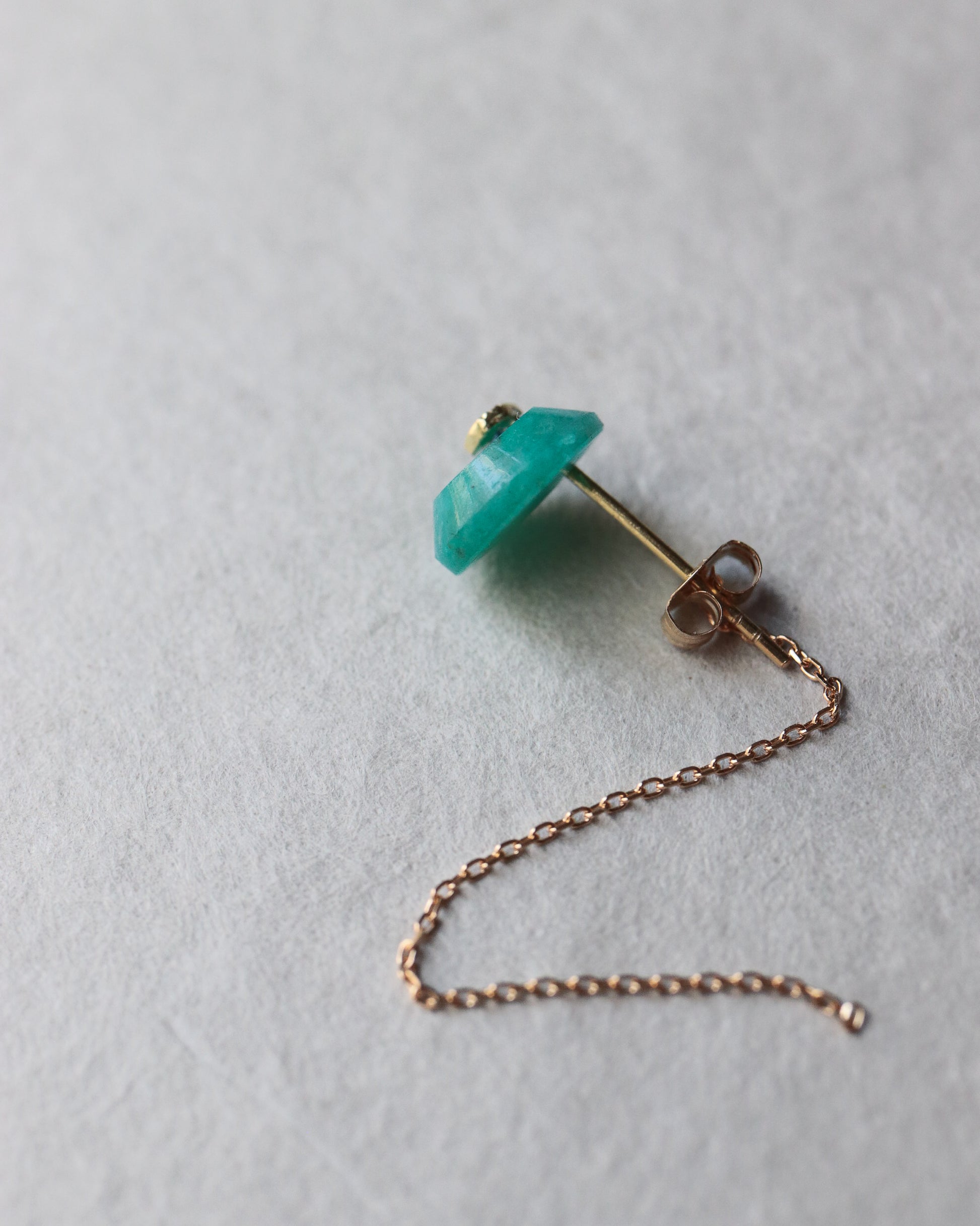 石の取り外しが可能で、ポストとチェーン付きのキャッチだけでシンプルに使用したり、チェーン付きのキャッチを他のピアスにも使用できる汎用性の高いデザインです。