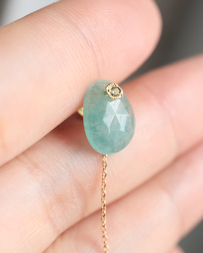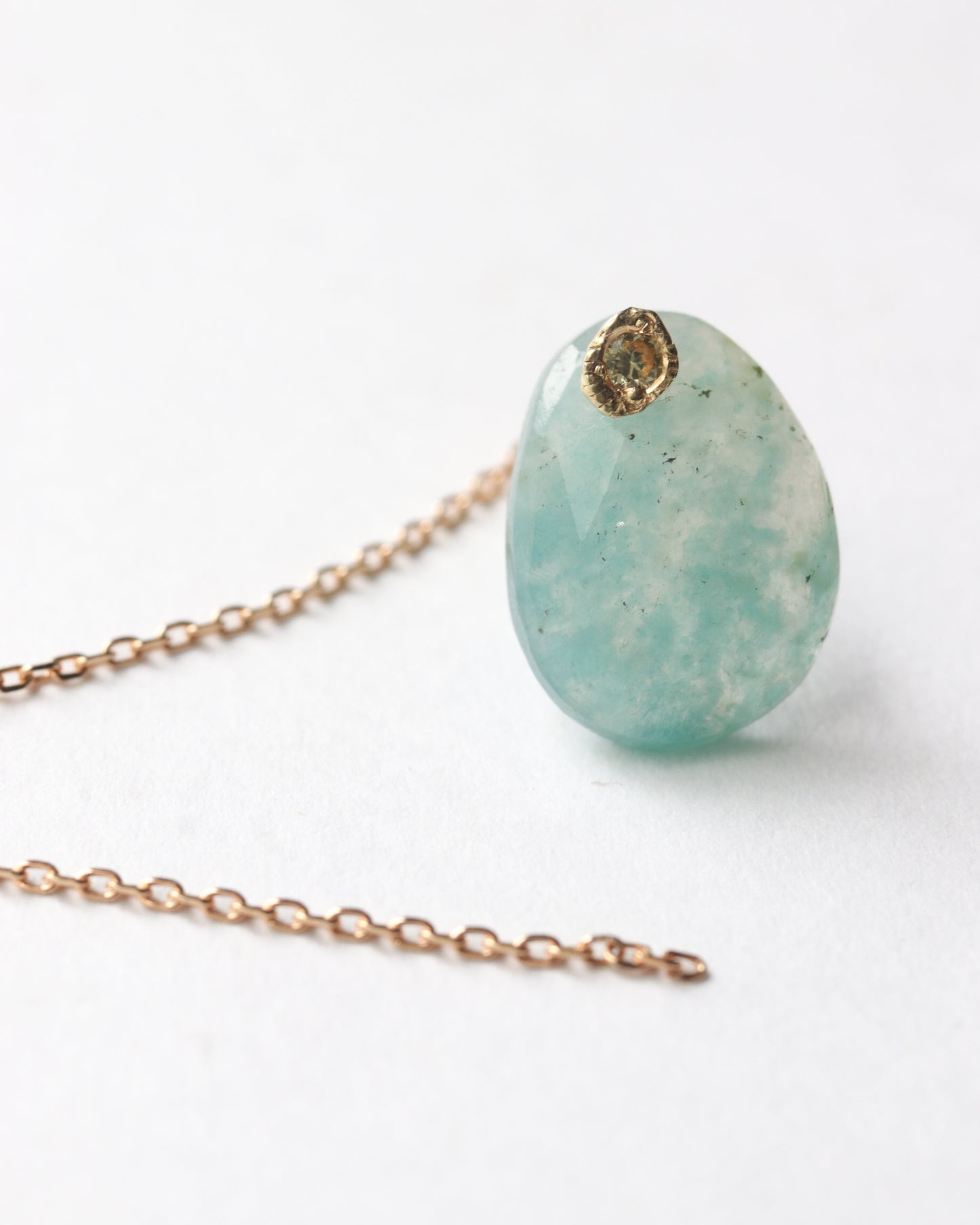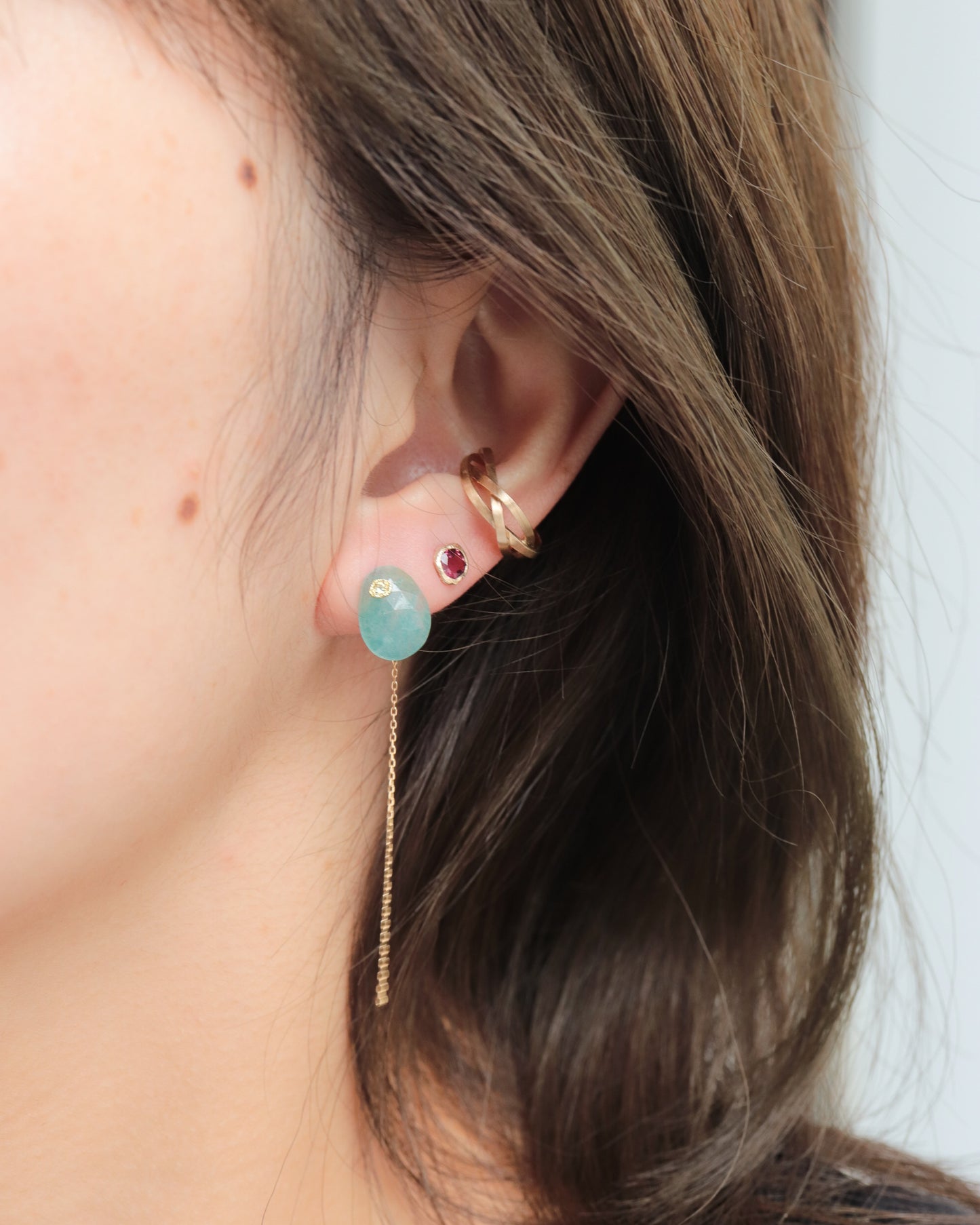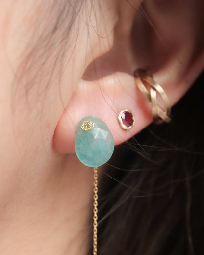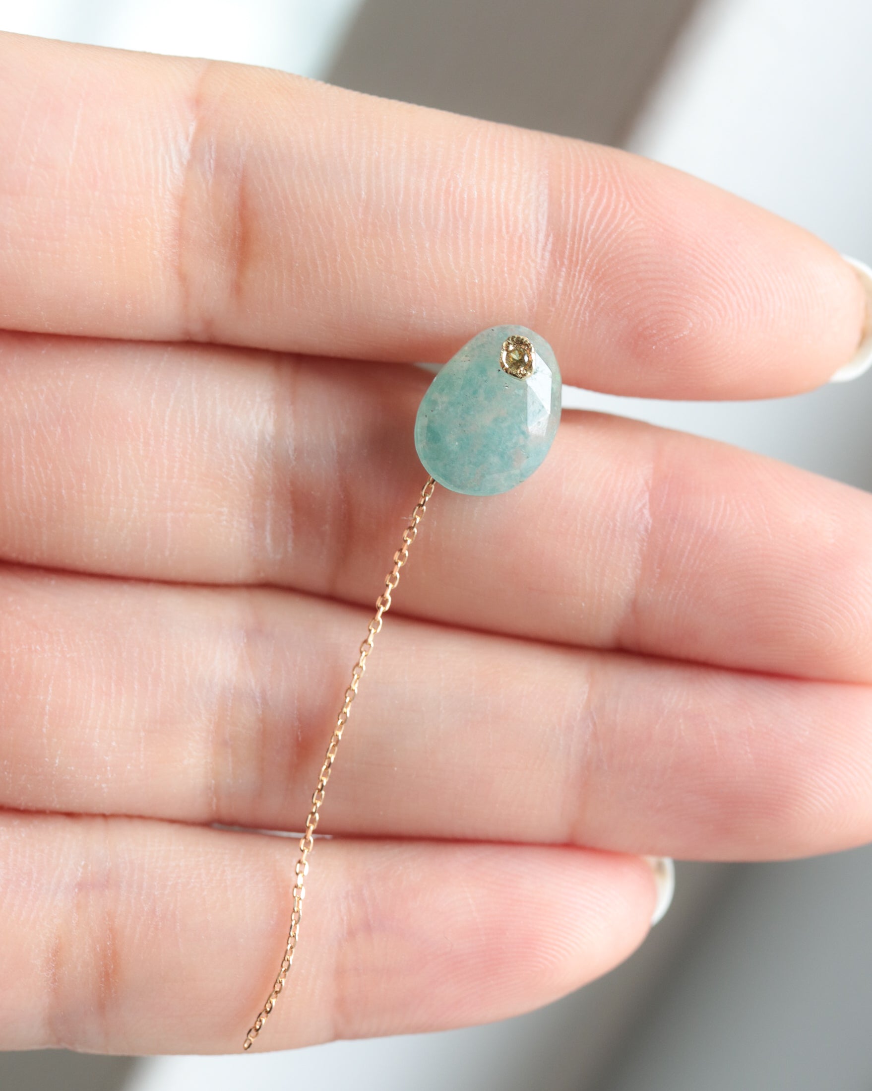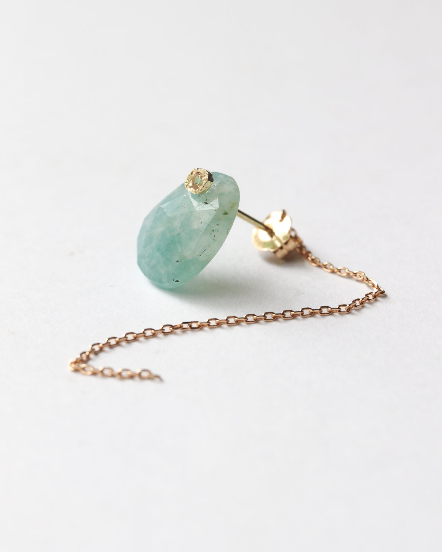 石の取り外しが可能で、サファイアポストとチェーン付きのキャッチだけでシンプルに使用したり、チェーン付きのキャッチを他のピアスにも使用できる汎用性の高いデザインです。石の裏表でカットが異なるので2つの表情が楽しめます。