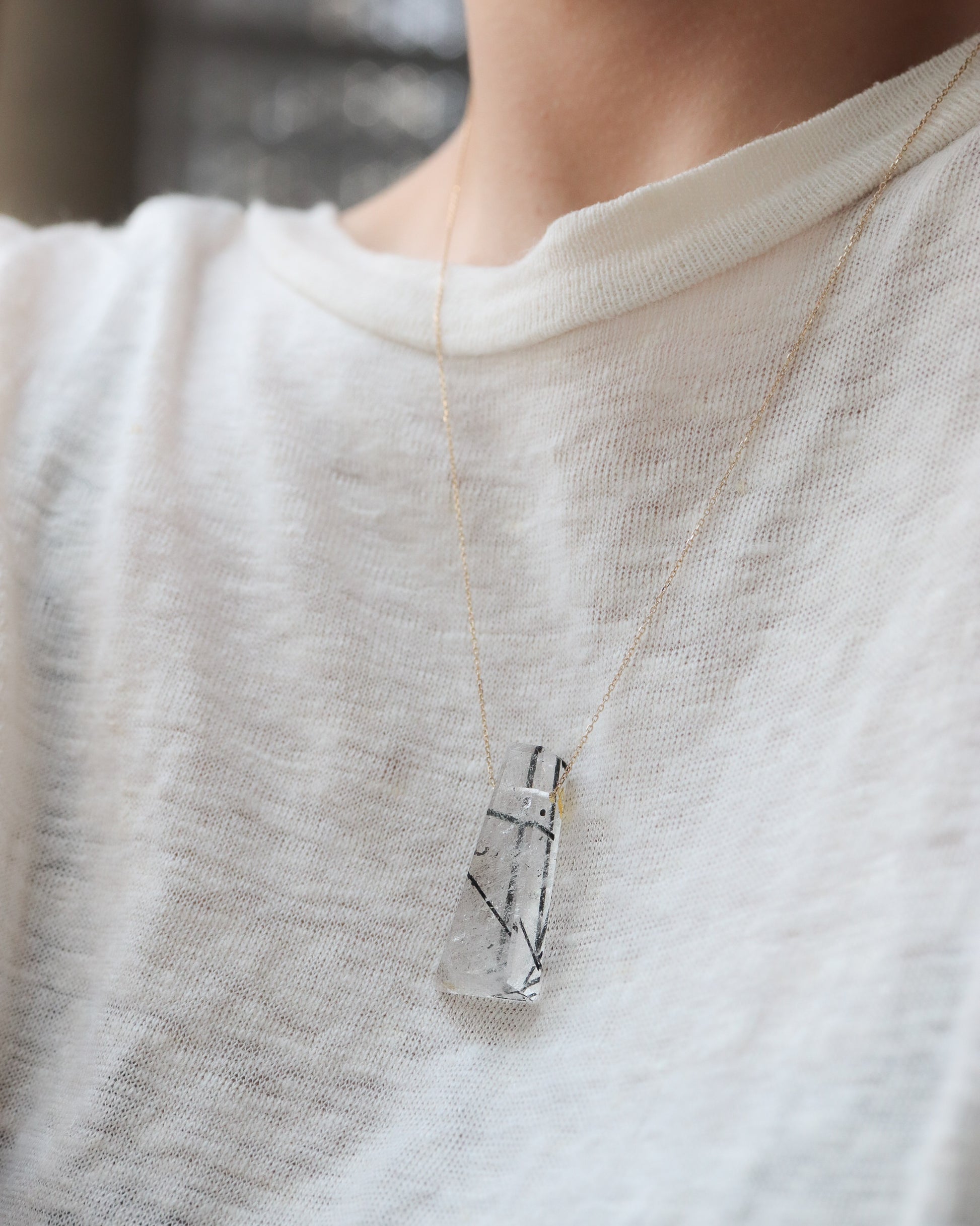 天然石を贅沢な大きさで使用したRockネックレス。クラックやインクルージョンをその石の個性と捉え、石枠を使用せずに最大限魅力を引き出したデザインです。チェーンにはさりげなくブランドプレートが付いています。