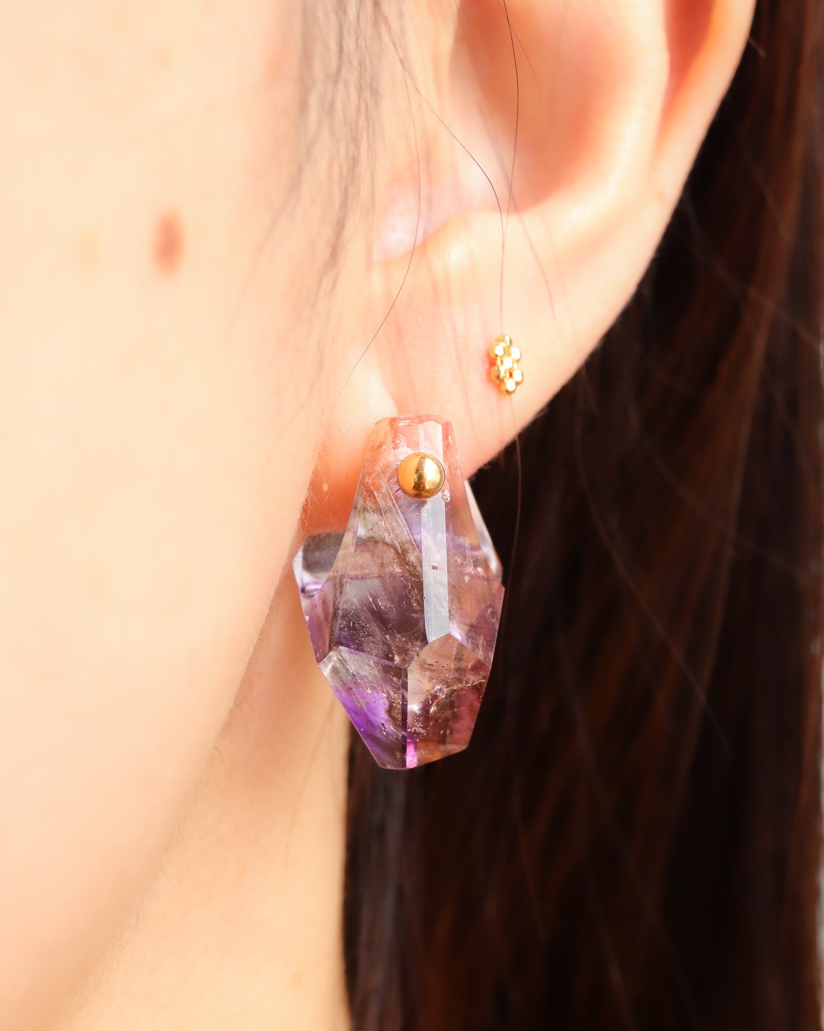 天然石の原石をそのままピアスにしたデザインは、同じ形が無くすべてが1点物。U字の石を耳たぶを挟むようにしてピアスのポストバーを通し、横顔も印象的に演出します。ポストを通す穴の位置を変えて、表裏どちらの面もお楽しみください。