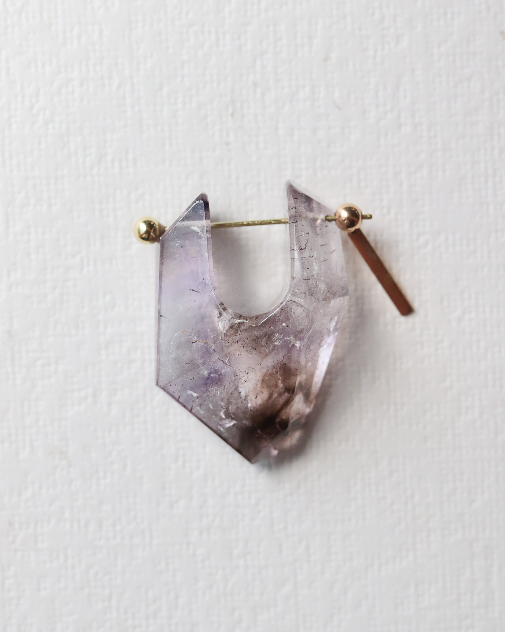 天然石の原石をそのままピアスにしたデザインは、同じ形が無くすべてが1点物。U字の石を耳たぶを挟むようにしてピアスのポストバーを通し、横顔も印象的に演出します。ポストを通す穴の位置を変えて、表裏どちらの面もお楽しみください。