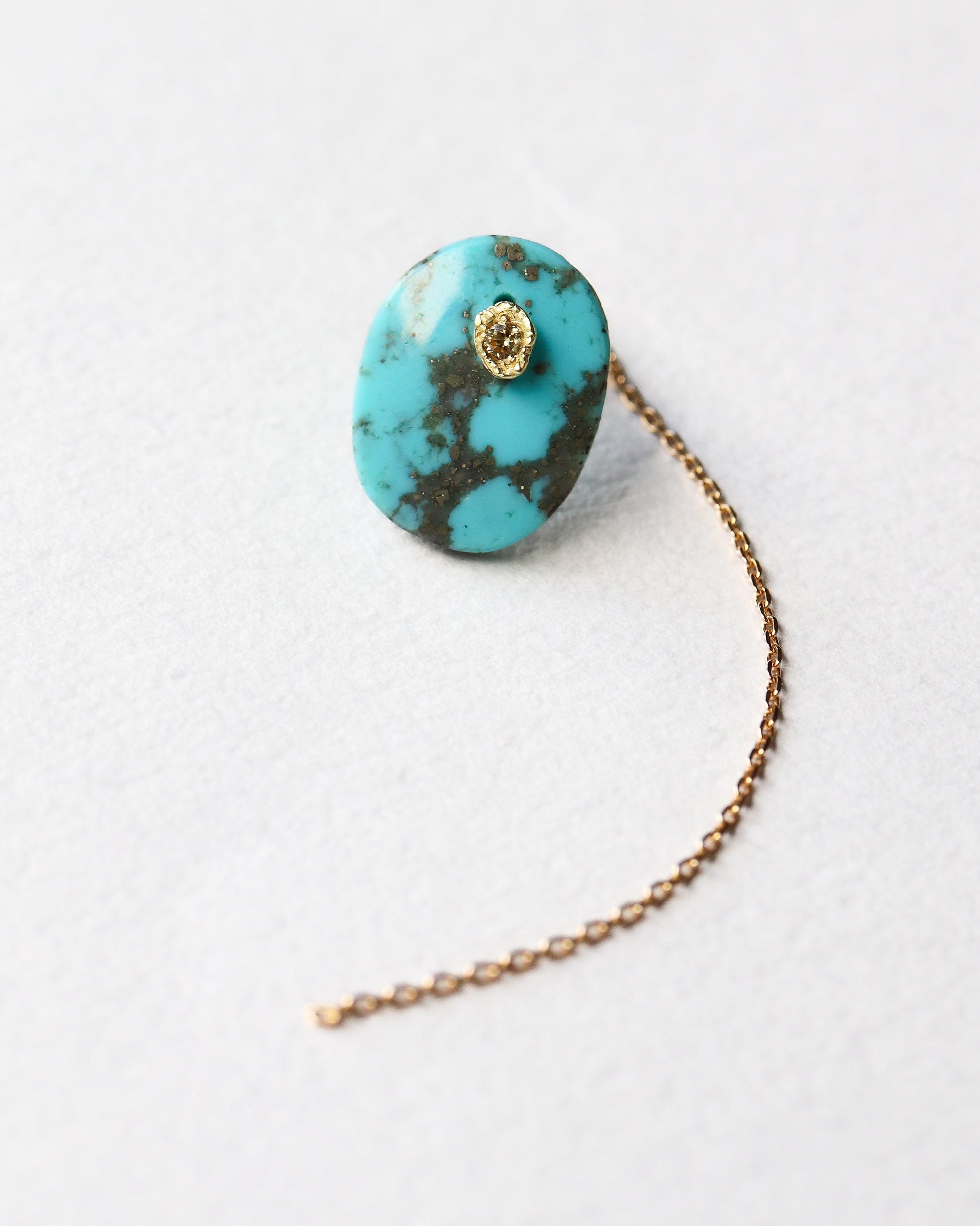 石の取り外しが可能で、サファイアポストとチェーン付きのキャッチだけでシンプルに使用したり、チェーン付きのキャッチを他のピアスにも使用できる汎用性の高いデザインです。石の裏表でカットが異なるので2つの表情が楽しめます。