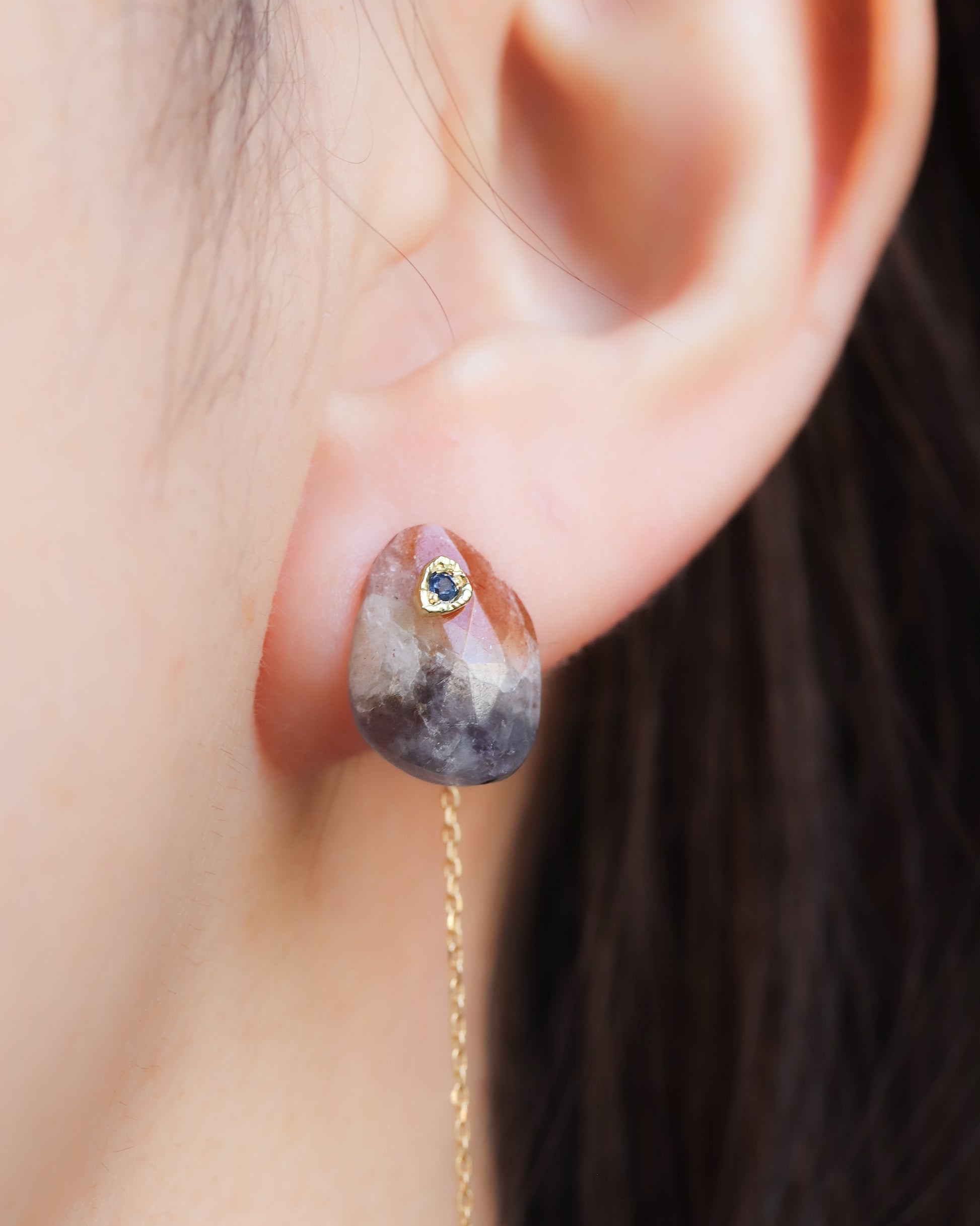 石の取り外しが可能で、サファイアポストとチェーン付きのキャッチだけでシンプルに使用したり、チェーン付きのキャッチを他のピアスにも使用できる汎用性の高いデザインです。石の裏表でカットが異なるので2つの表情が楽しめます。
