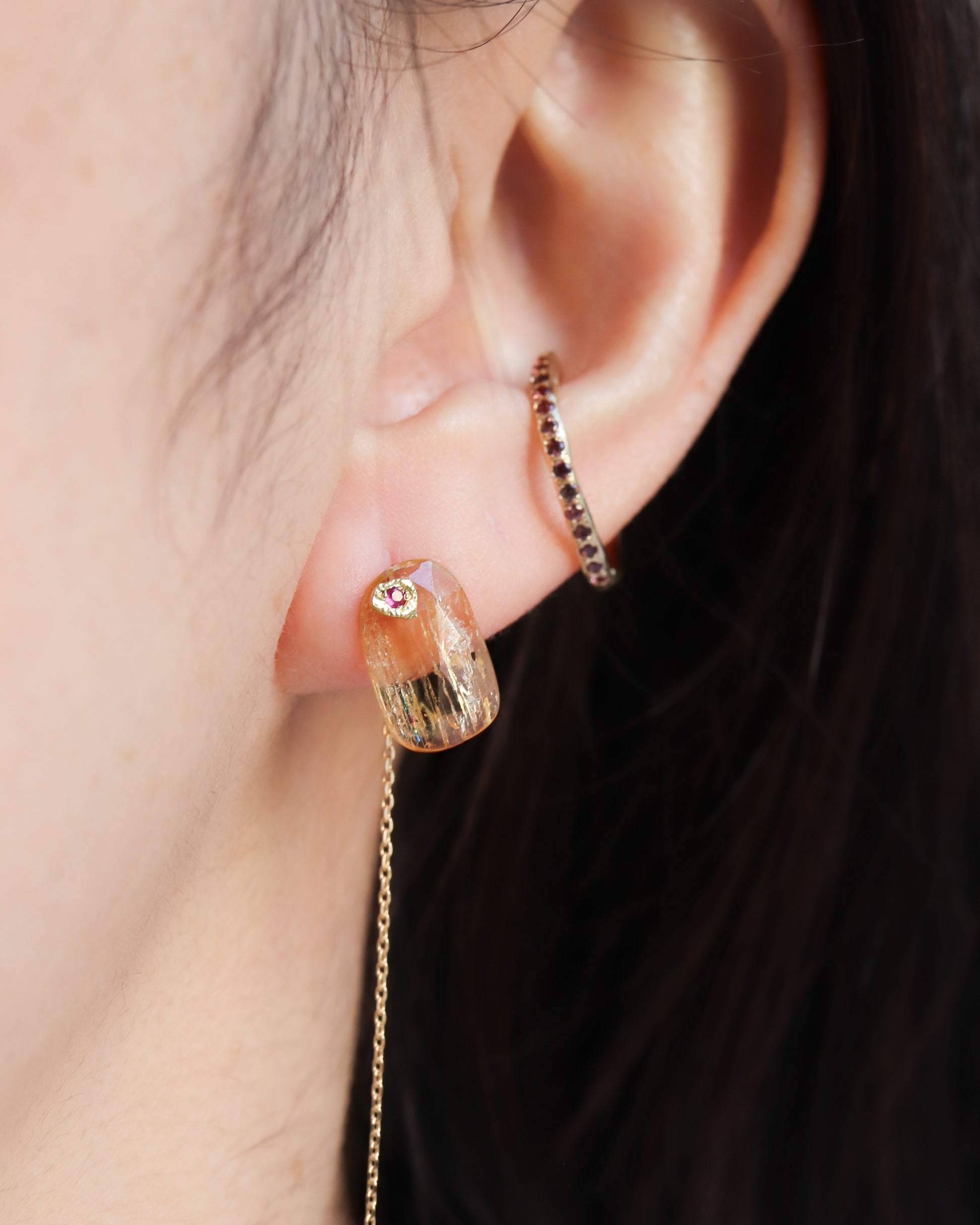 石の取り外しが可能で、サファイアポストとチェーン付きのキャッチだけでシンプルに使用したり、チェーン付きのキャッチを他のピアスにも使用できる汎用性の高いデザインです。石の裏表でカットが異なるので2つの表情が楽しめます。