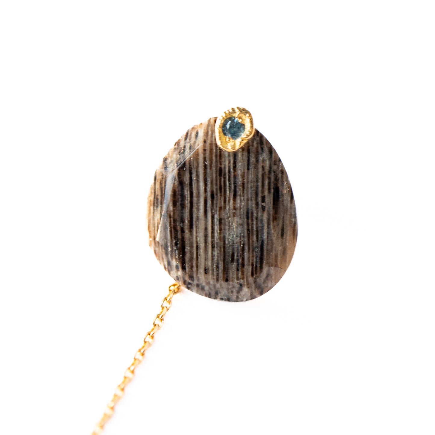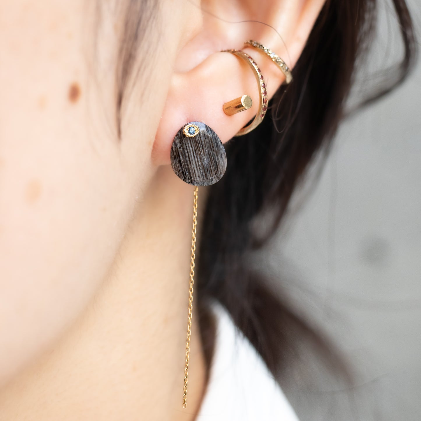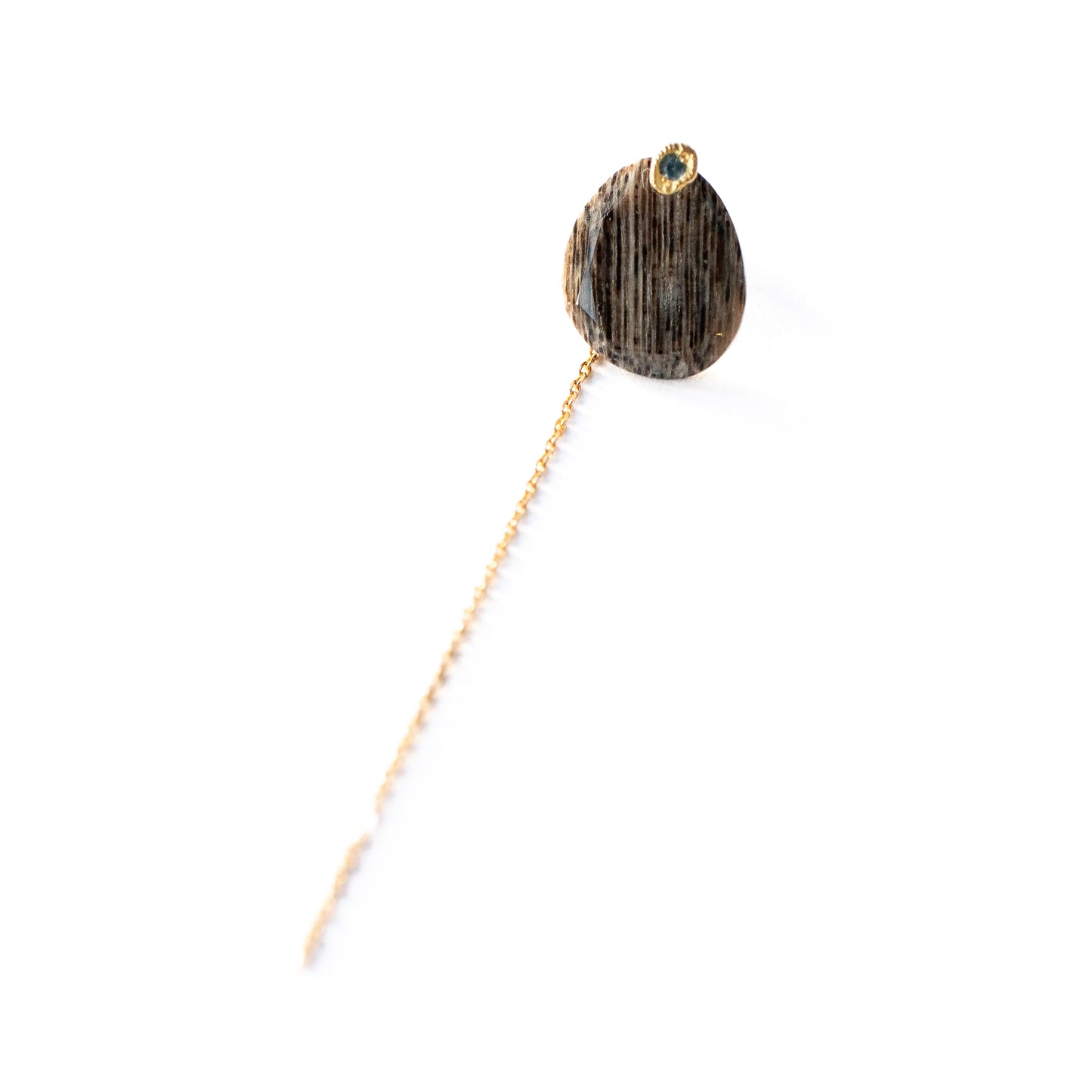 石の取り外しが可能で、サファイアポストとチェーン付きのキャッチだけでシンプルに使用したり、チェーン付きのキャッチを他のピアスにも使用できる汎用性の高いデザインです。石の裏表でカットが異なるので2つの表情が楽しめます。