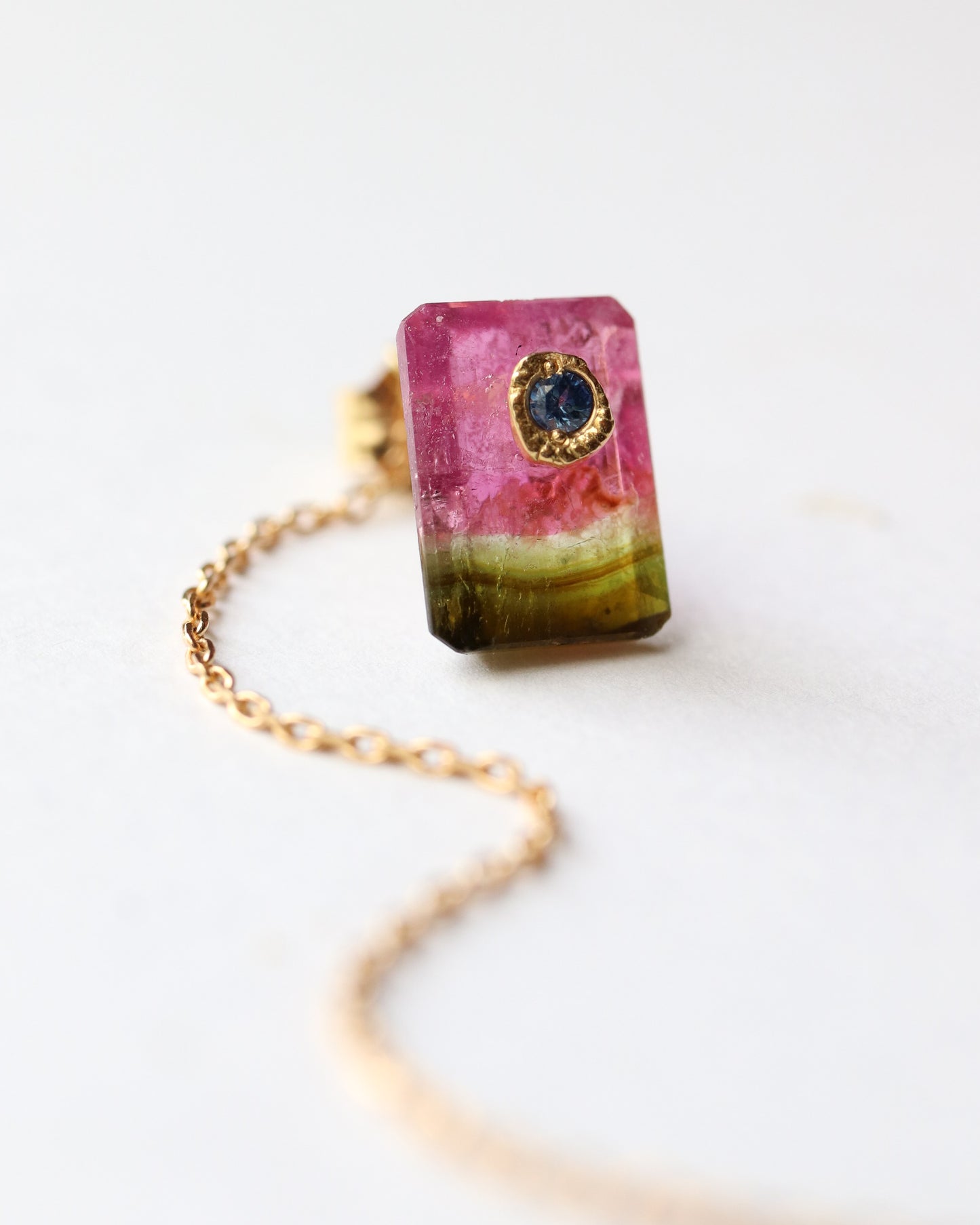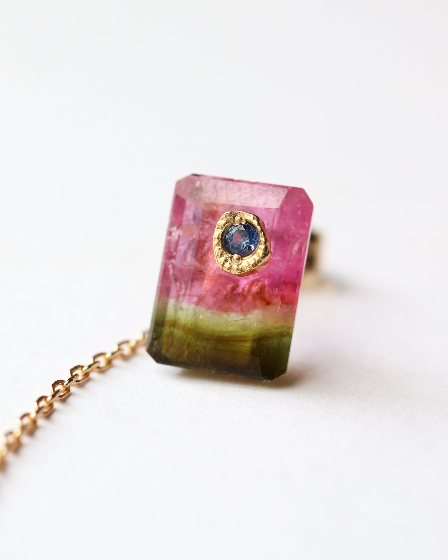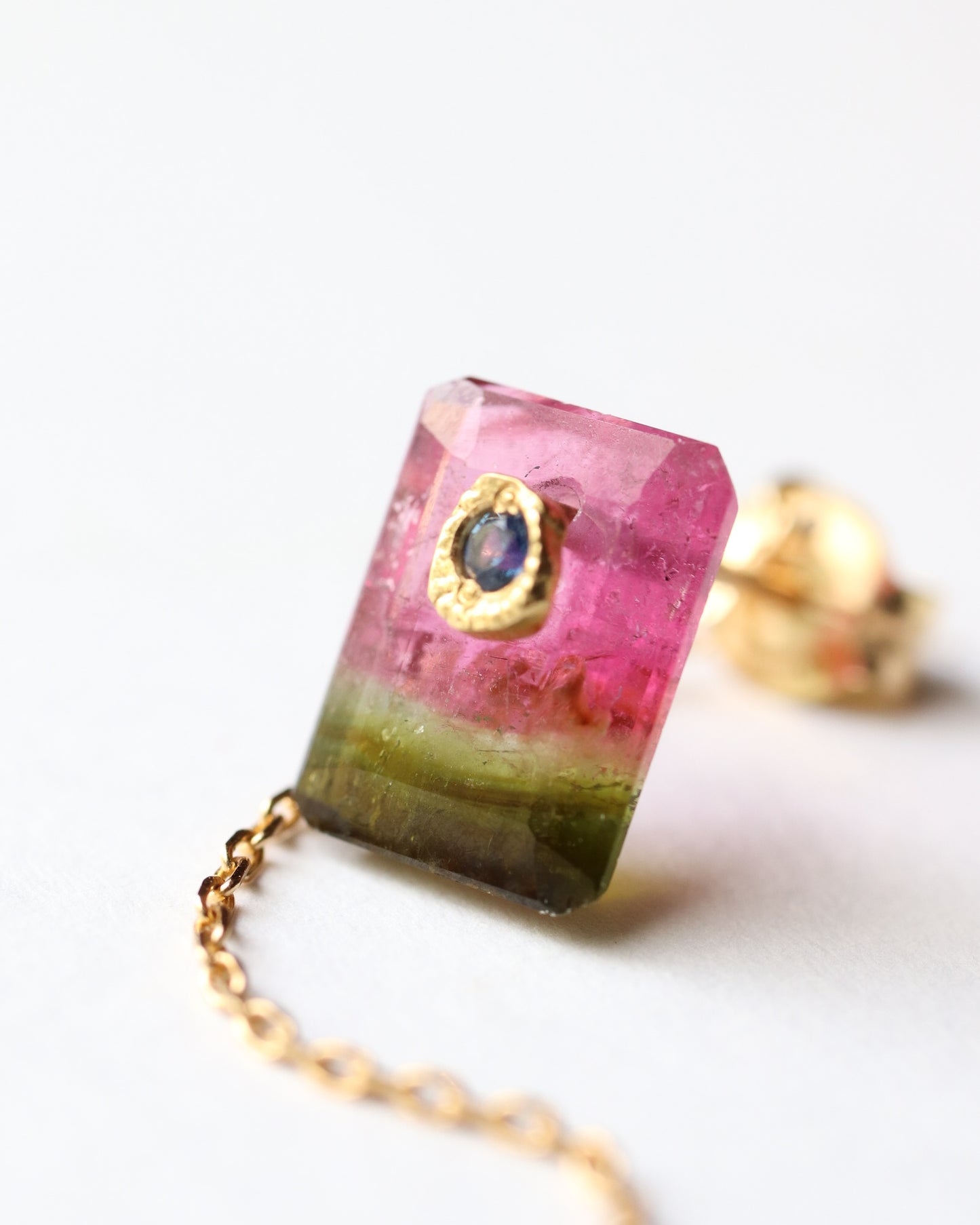 石の取り外しが可能で、サファイアポストとチェーン付きのキャッチだけでシンプルに使用したり、チェーン付きのキャッチを他のピアスにも使用できる汎用性の高いデザインです。石の裏表でカットが異なるので2つの表情が楽しめます。