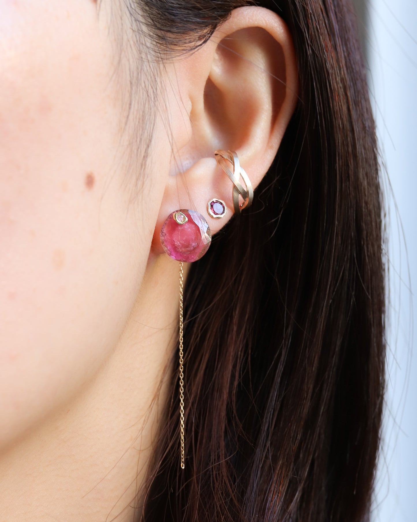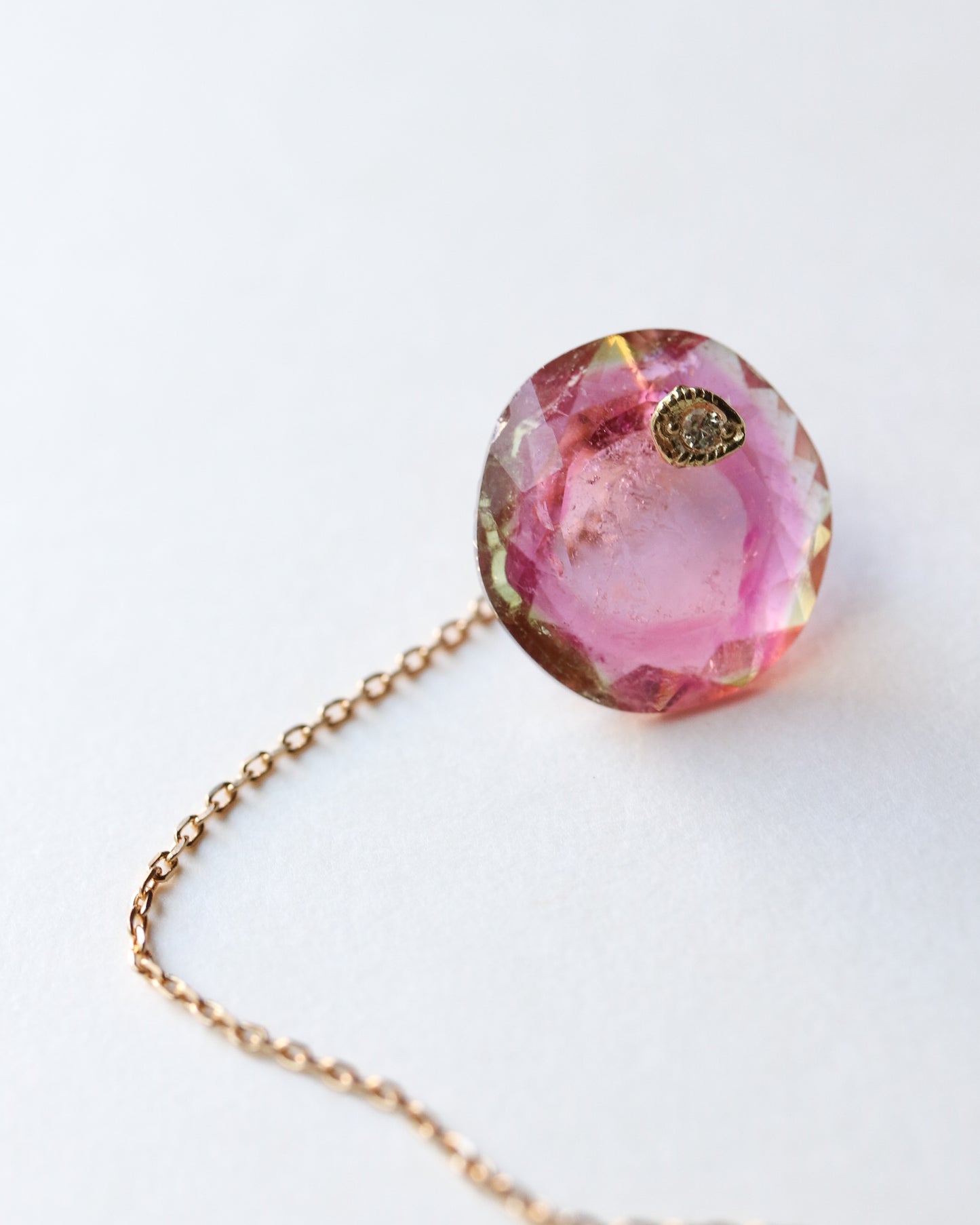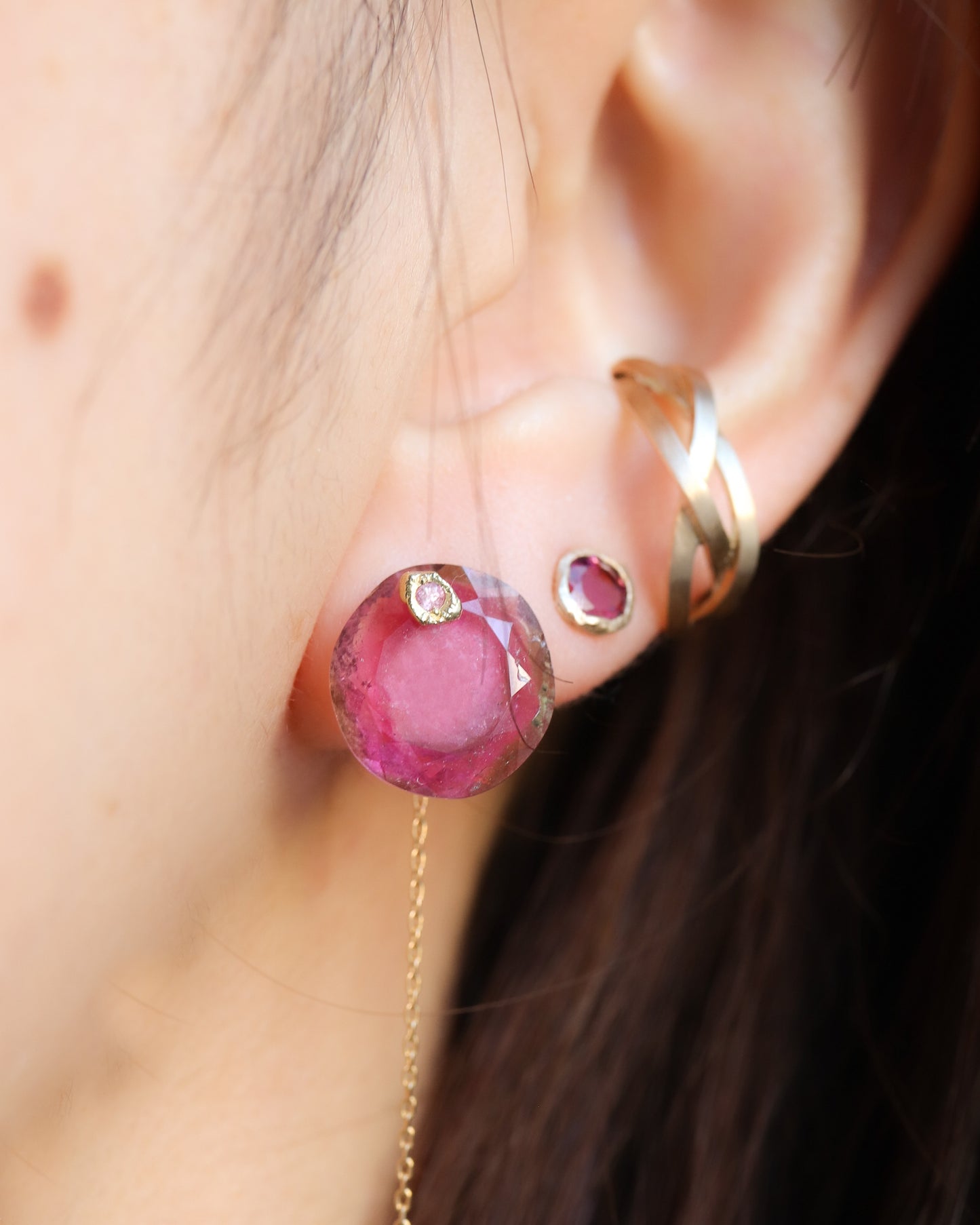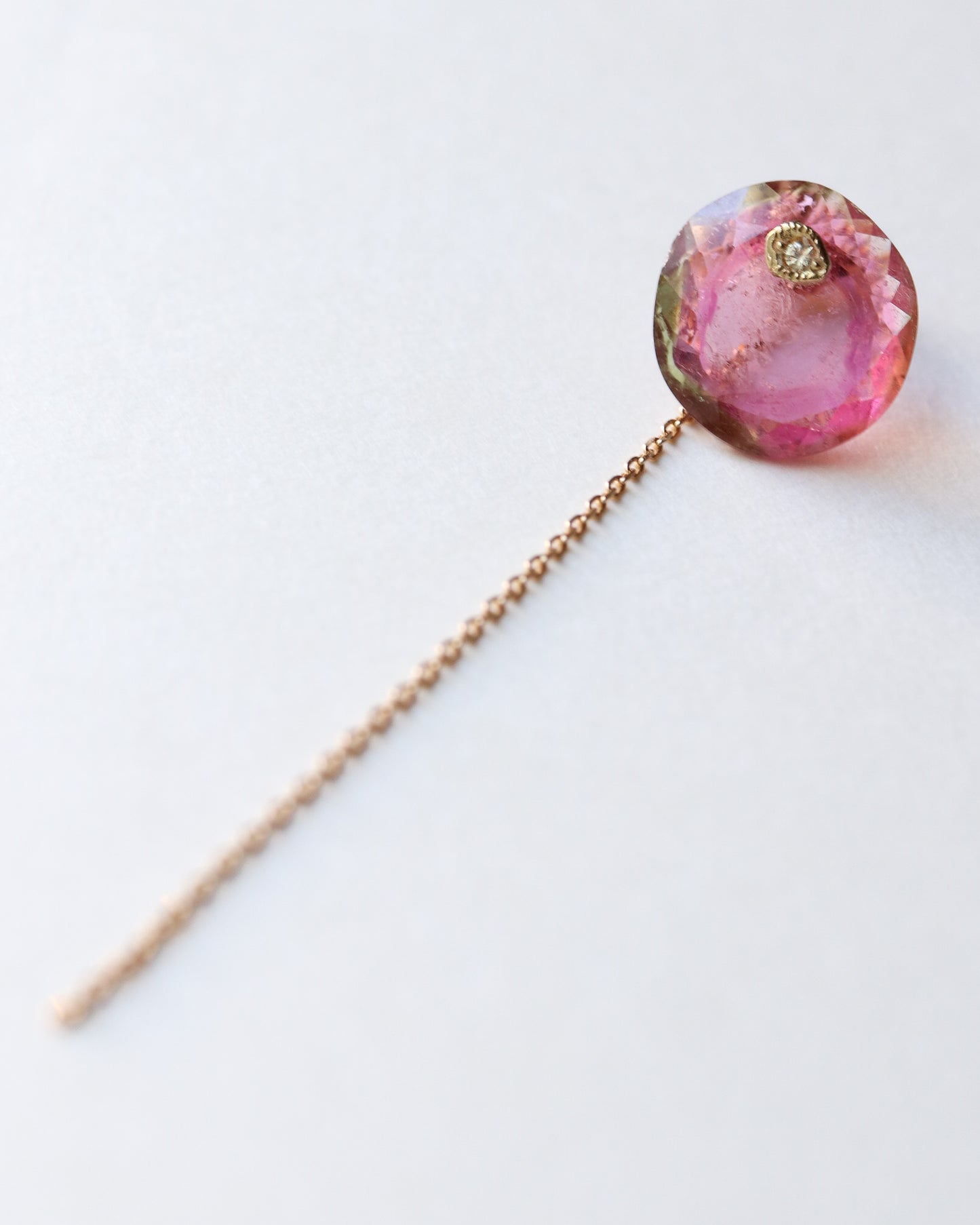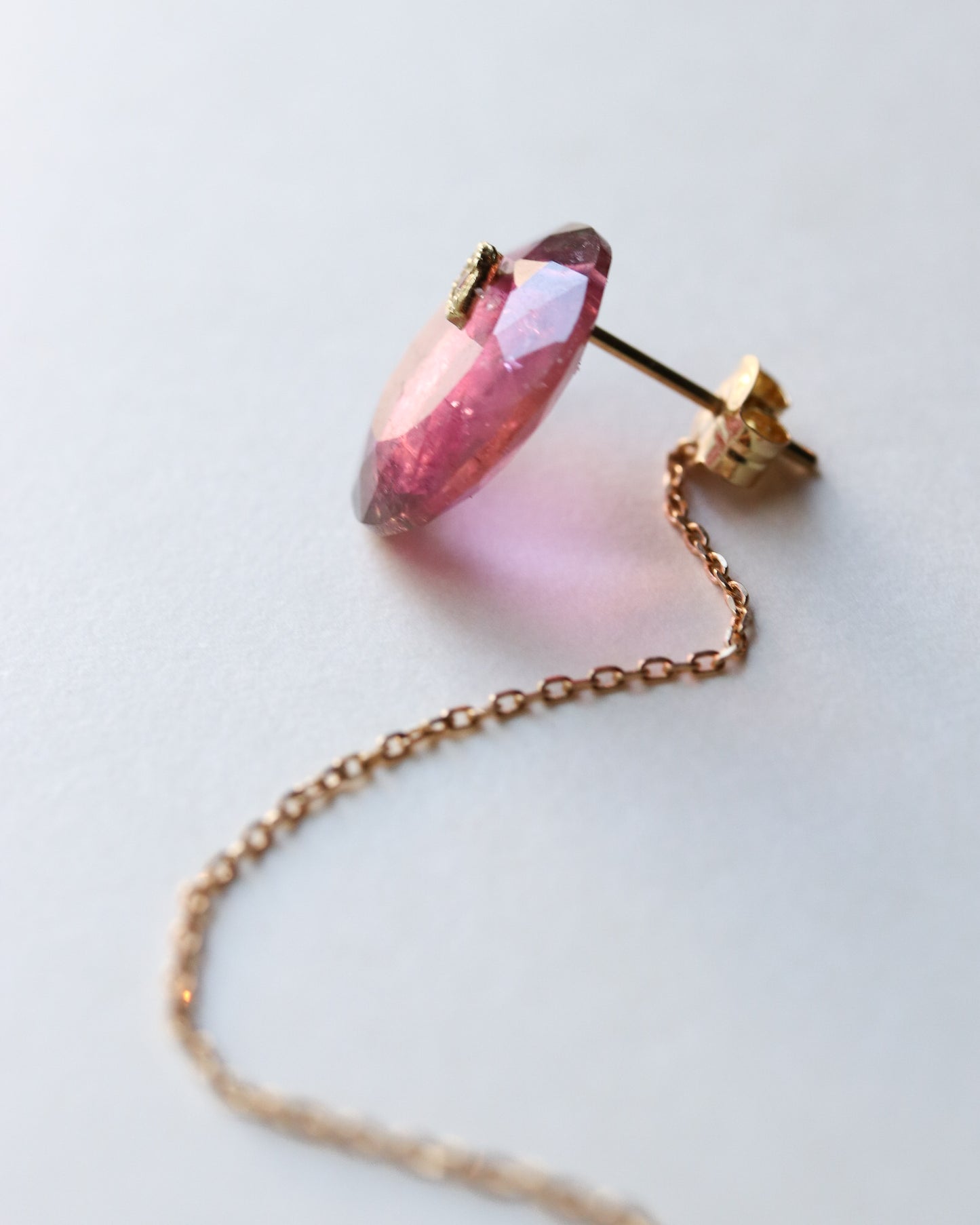 石の取り外しが可能で、サファイアポストとチェーン付きのキャッチだけでシンプルに使用したり、チェーン付きのキャッチを他のピアスにも使用できる汎用性の高いデザインです。石の裏表でカットが異なるので2つの表情が楽しめます。