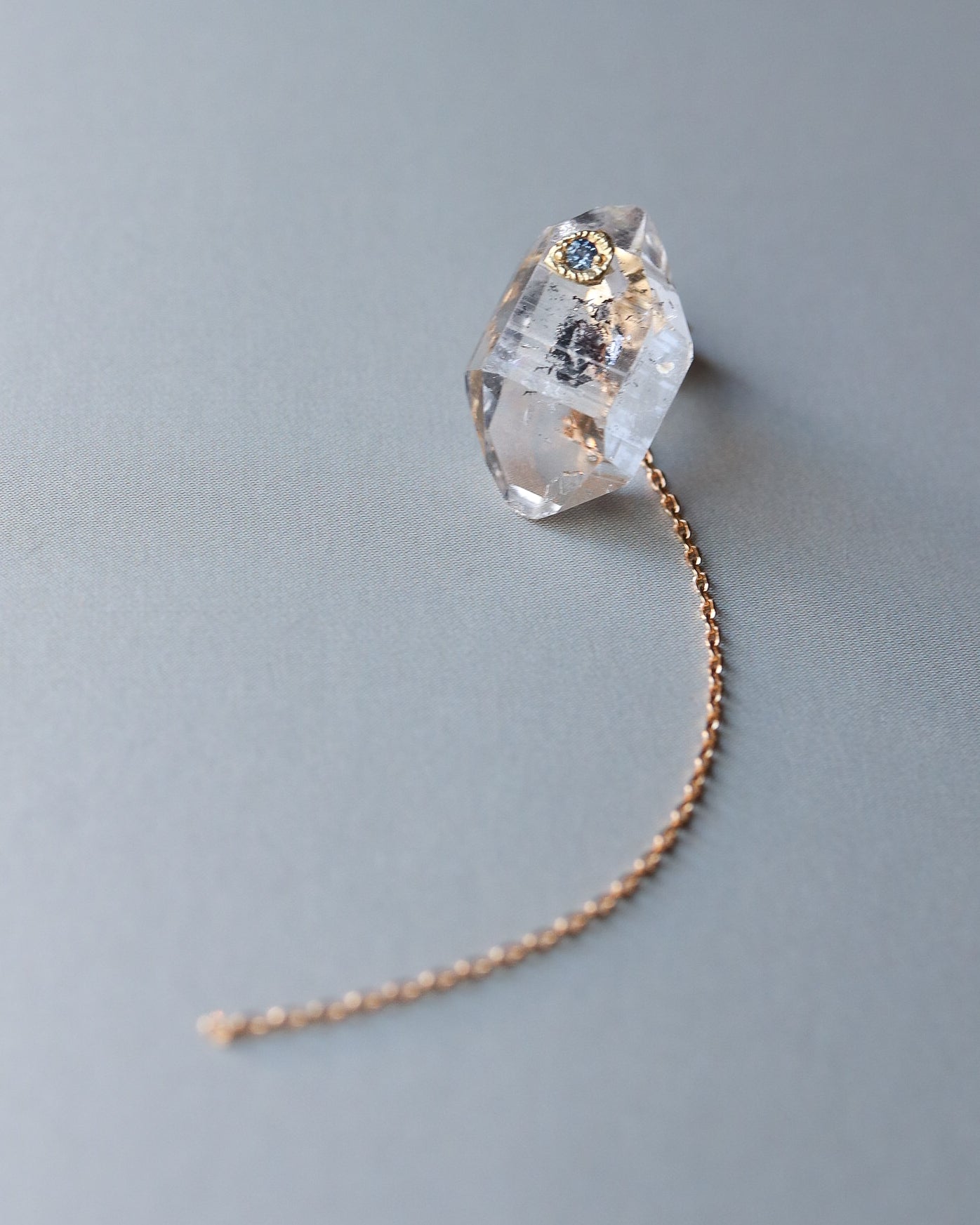 石の取り外しが可能で、ポストとチェーン付きのキャッチだけでシンプルに使用したり、チェーン付きのキャッチを他のピアスにも使用できる汎用性の高いデザインです。
