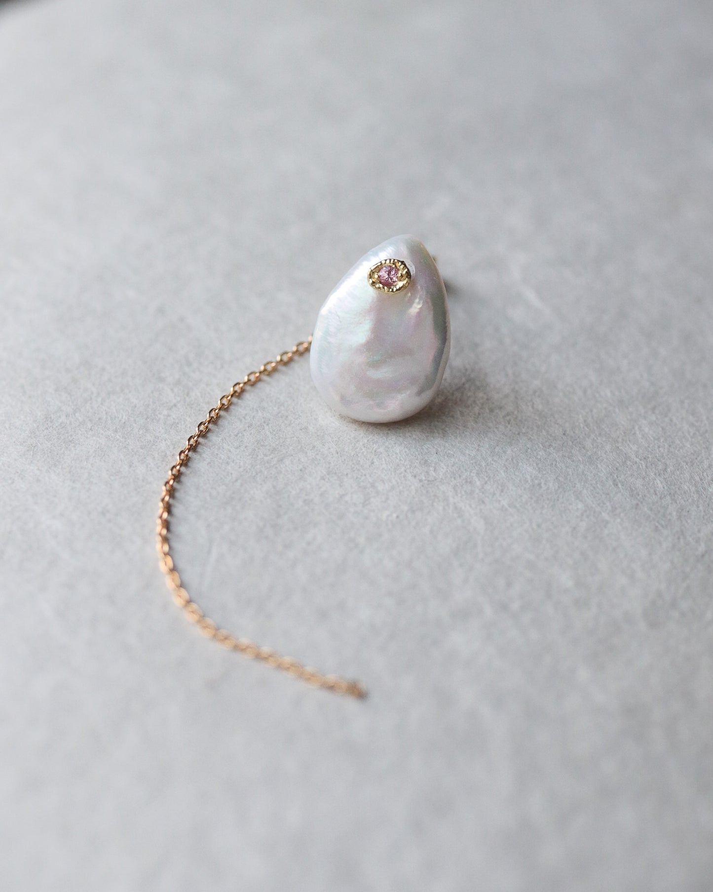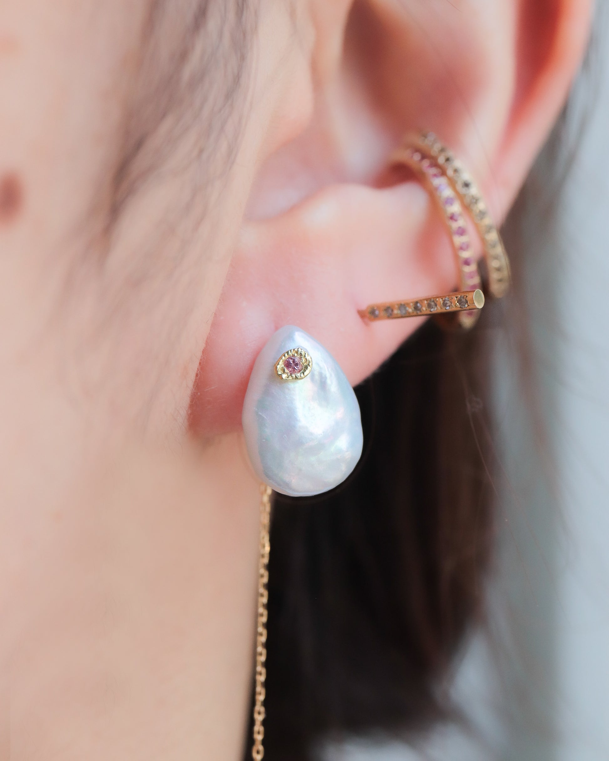 石の取り外しが可能で、サファイアポストとチェーン付きのキャッチだけでシンプルに使用したり、チェーン付きのキャッチを他のピアスにも使用できる汎用性の高いデザインです。石の裏表でカットが異なるので2つの表情が楽しめます。
