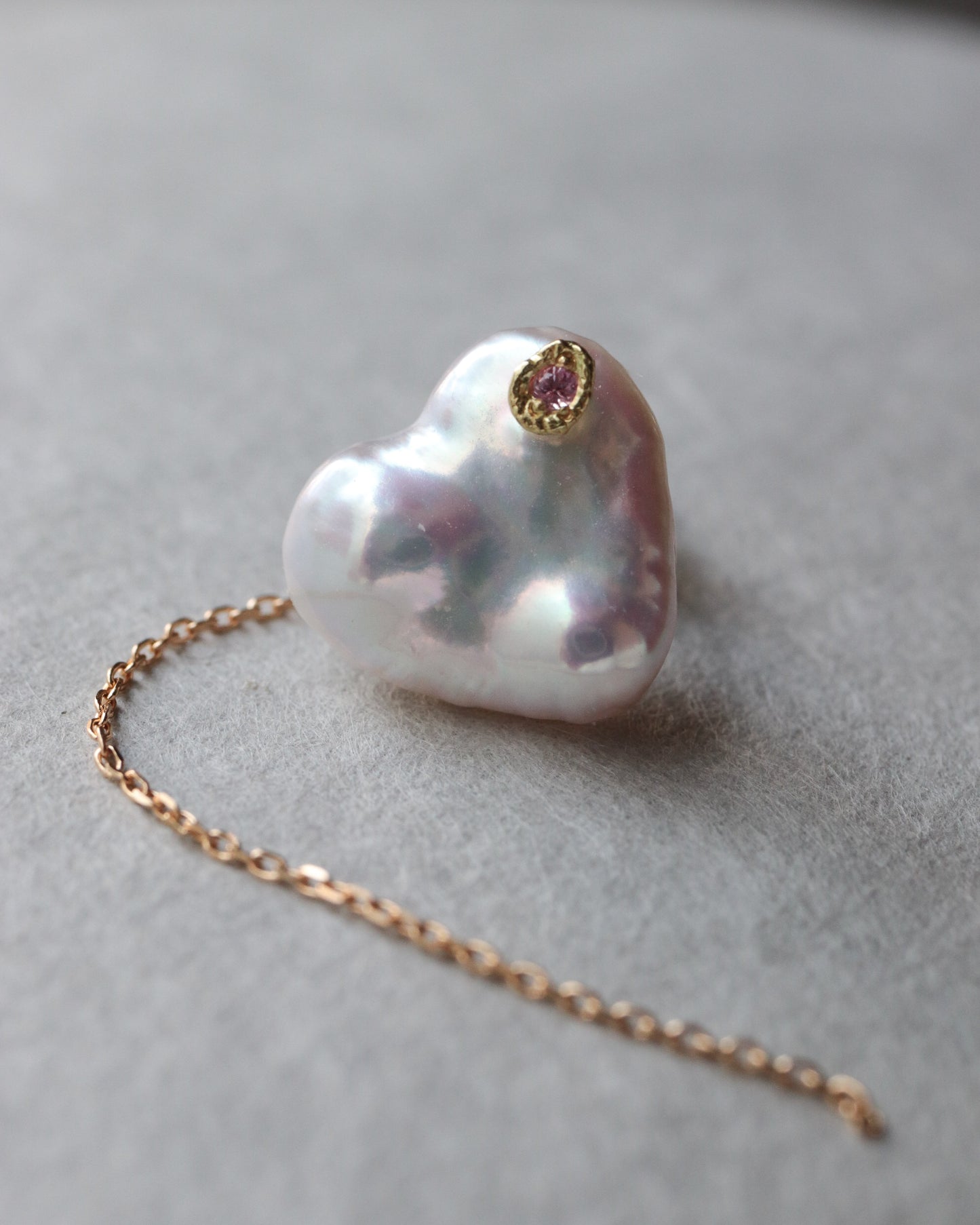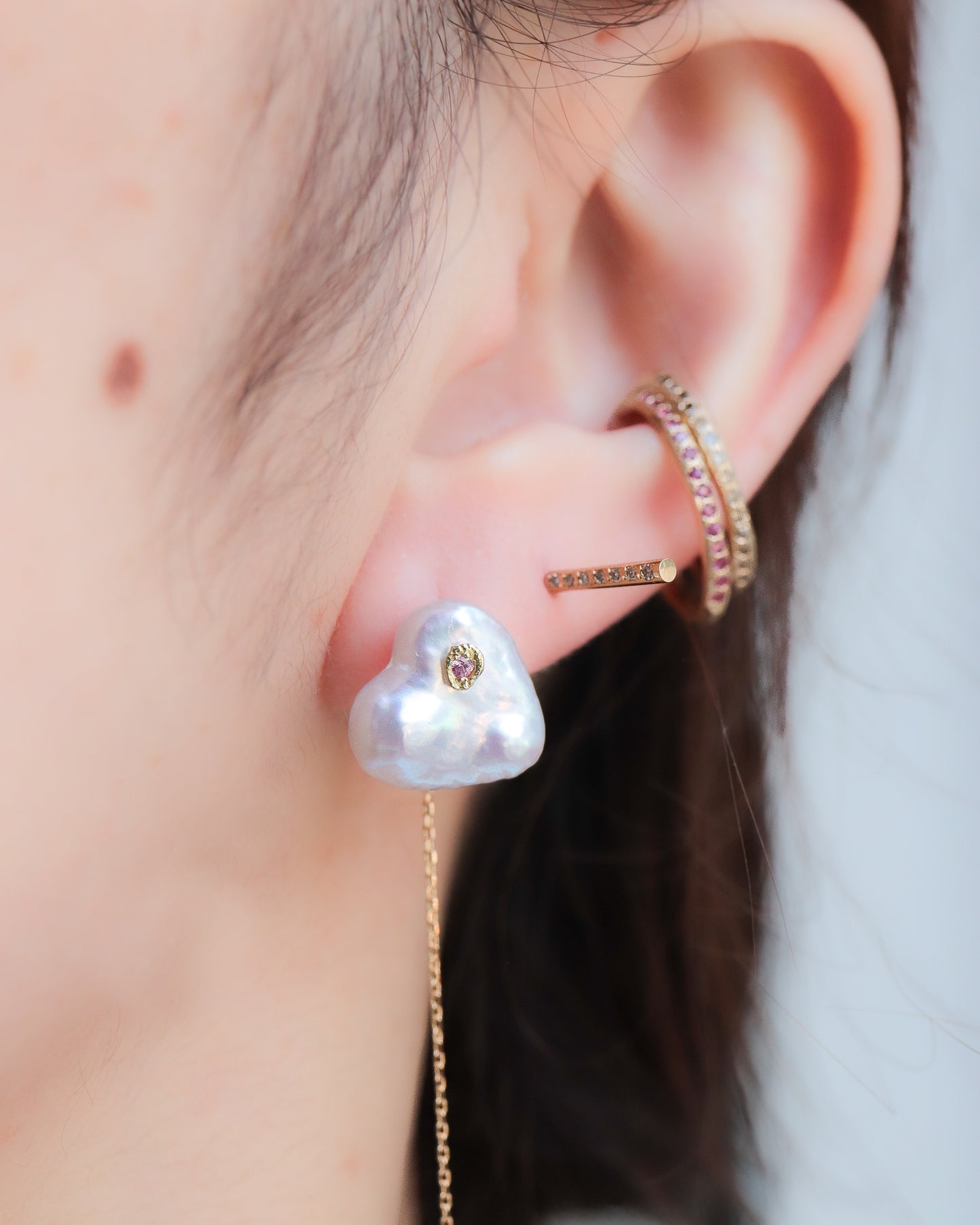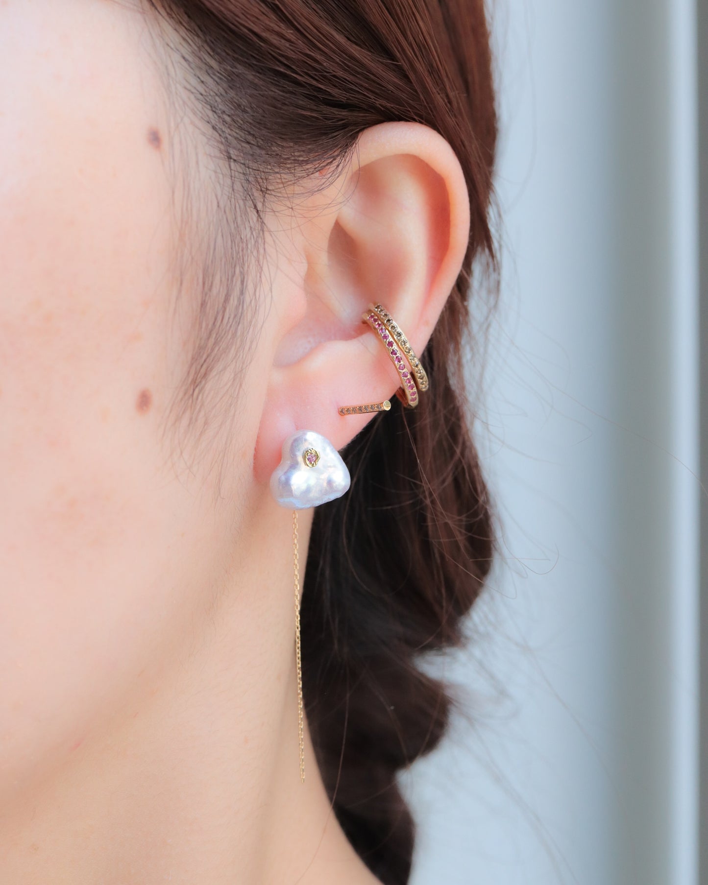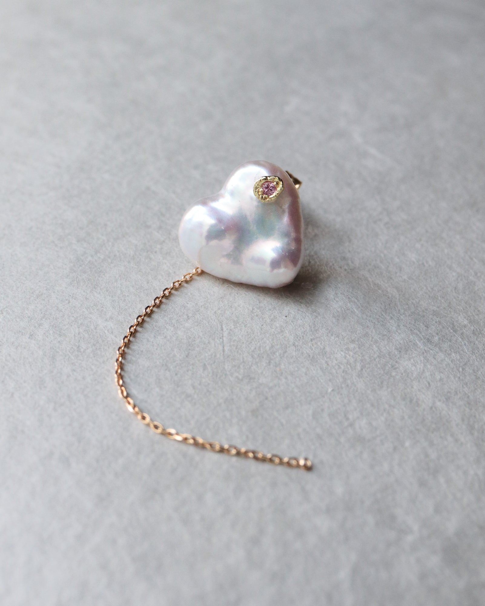 石の取り外しが可能で、サファイアポストとチェーン付きのキャッチだけでシンプルに使用したり、チェーン付きのキャッチを他のピアスにも使用できる汎用性の高いデザインです。石の裏表でカットが異なるので2つの表情が楽しめます。