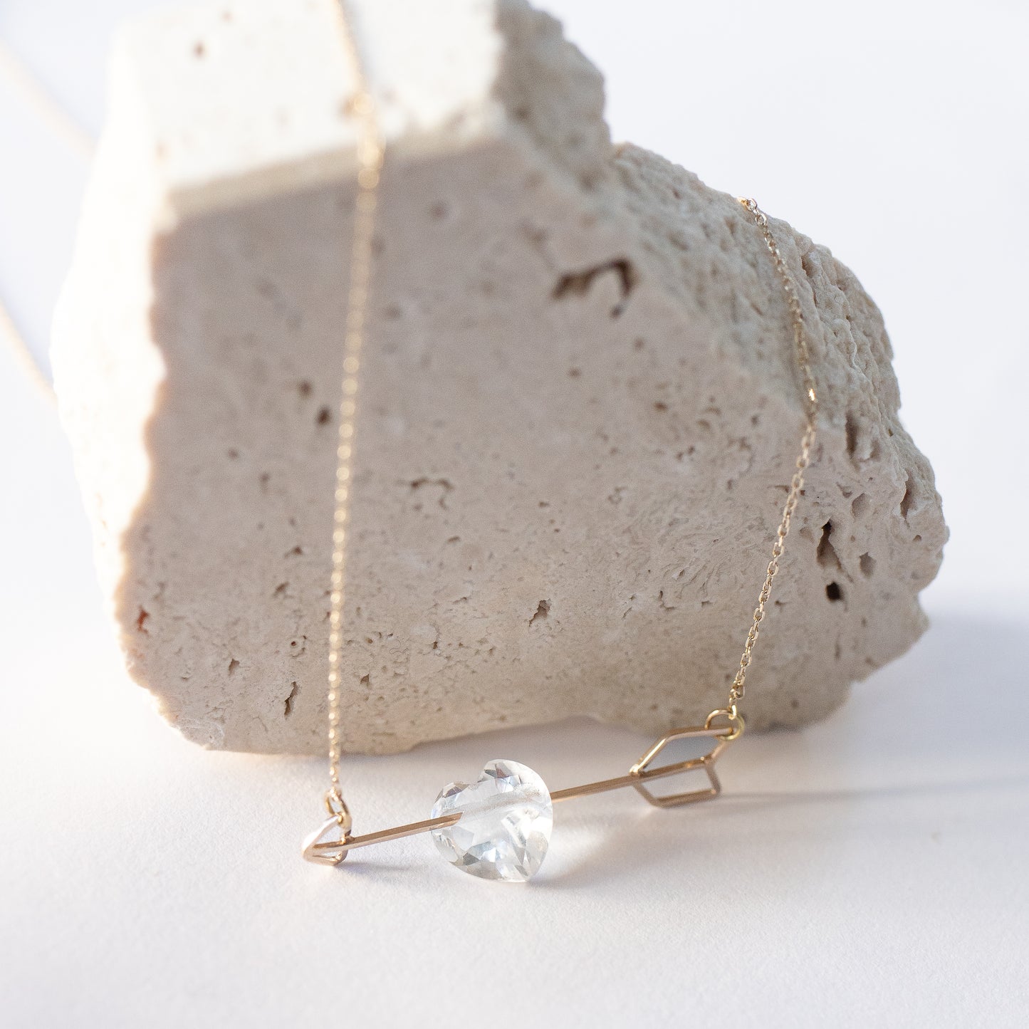 定番のガーネットに比べ、サイズ感が少し大きくなりハートのボリューム感がアップしました。瑞々しい透明感に満ち溢れ、眩い輝きを放つクォーツ。クリアで涼しげな印象を胸元で演出します。