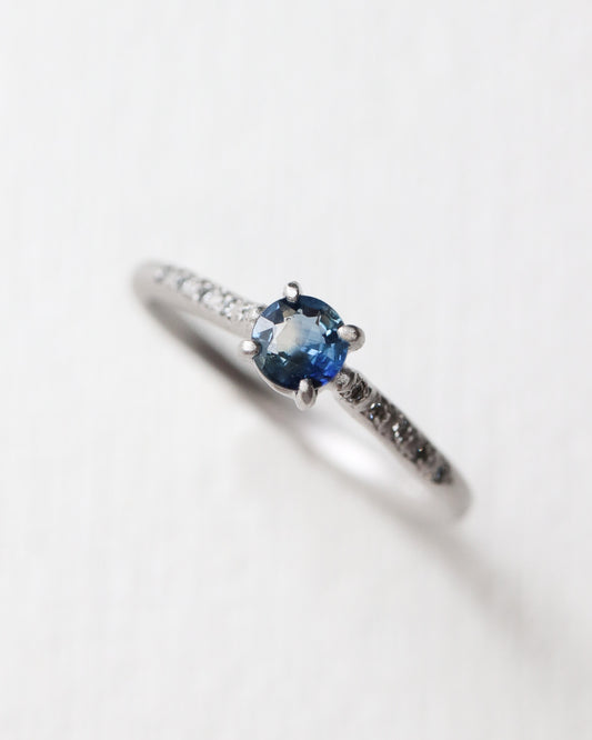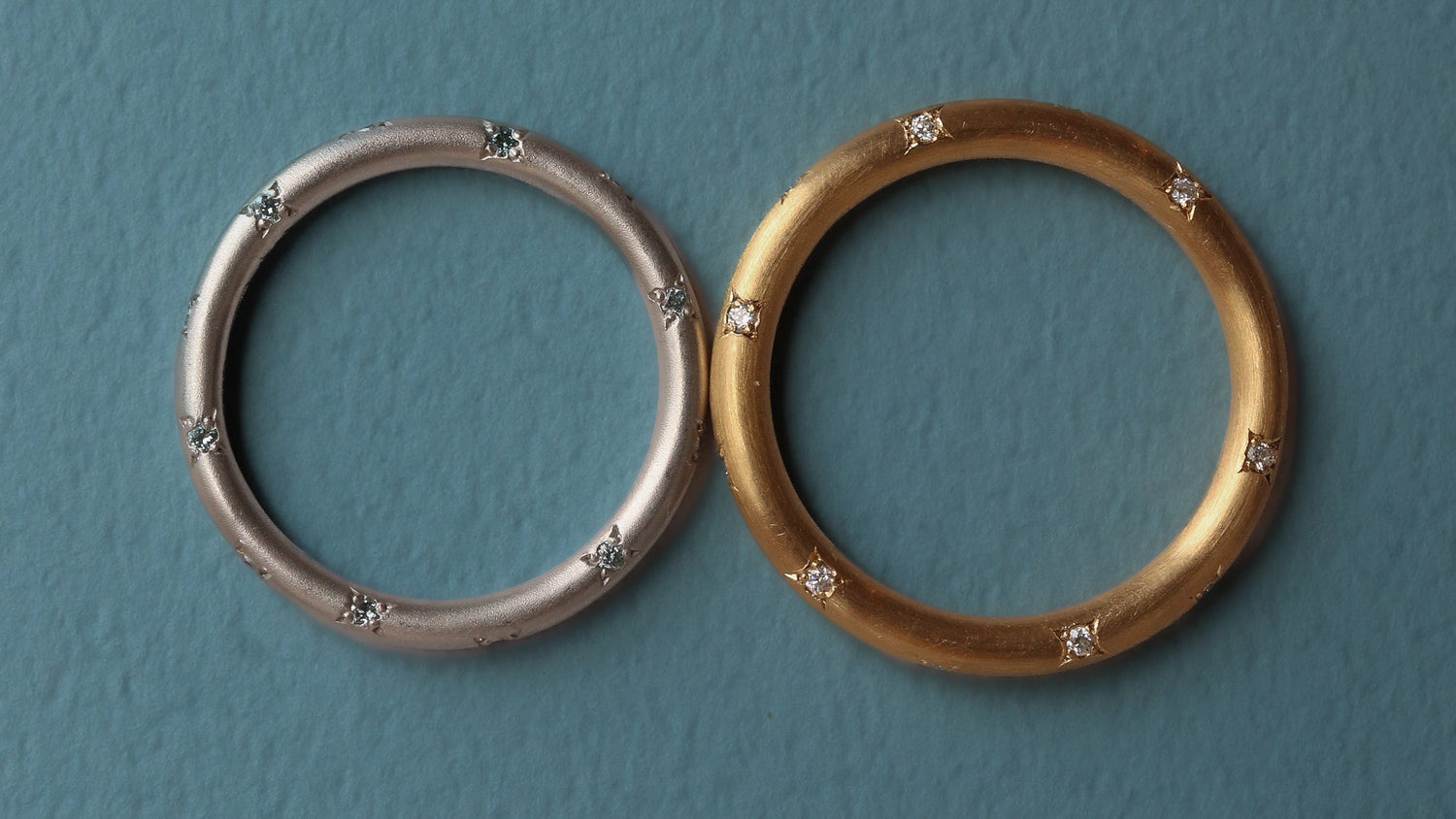 めぐり合わせや切れ目のない関係を、ラウンドのシンプルなリングで表現したen。ダイアモンド、ブルーダイアモンド、エメラルドはファッションとしても。四光留めと技法でダイアモンド1点1点を丁寧に彫留めし、どこまでも輝く星空をイメージして、どの角度から見てもドット状に見えるようにダイアモンドをセッティングしました。