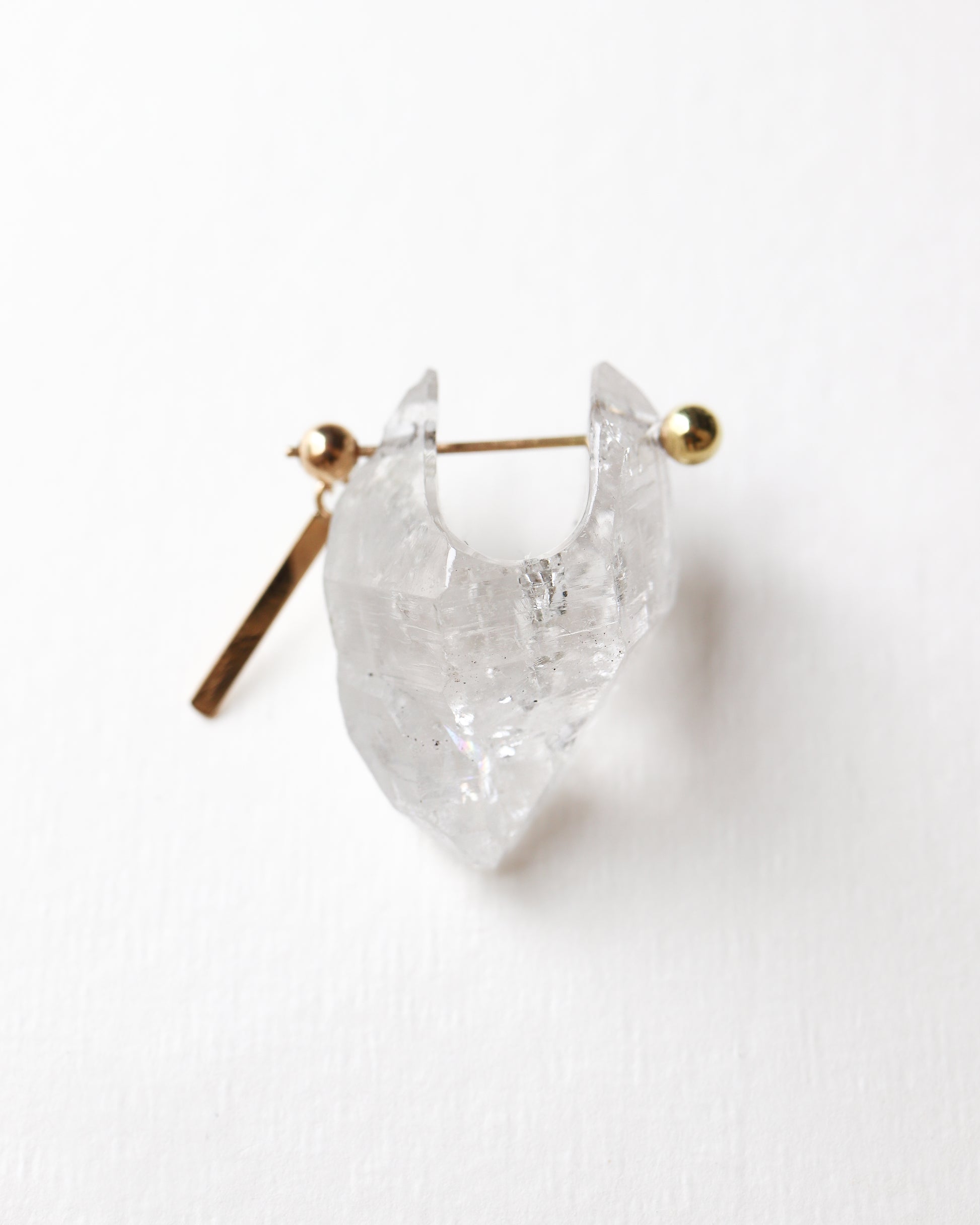 天然石の原石をそのままピアスにしたデザインは、同じ形が無くすべてが1点物。U字の石を耳たぶを挟むようにしてピアスのポストバーを通し、横顔も印象的に演出します。ポストを通す穴の位置を変えて、表裏どちらの面もお楽しみください。